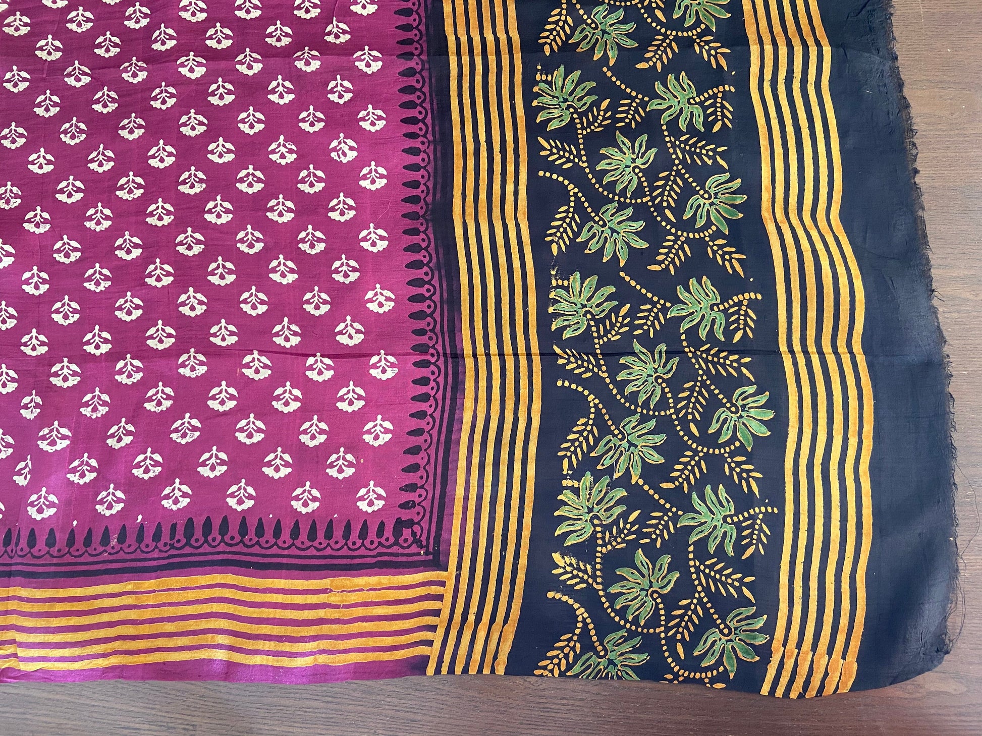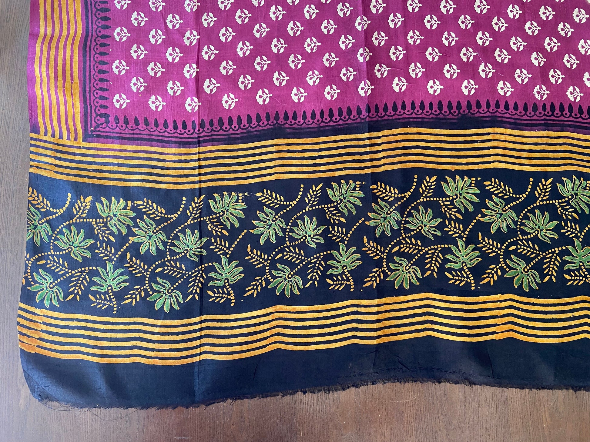 Here's one with a delicate floral pattern in off-white, on a rich purple silk fabric. With a broad black 'pallu' - the two ends of the stole. And yellow stripes running across the borders to create a beautiful contrast. The silk has a very luxurious hand feel and soft fall and drape. To give a very royal look to anything it's used on or anyone who wears it.