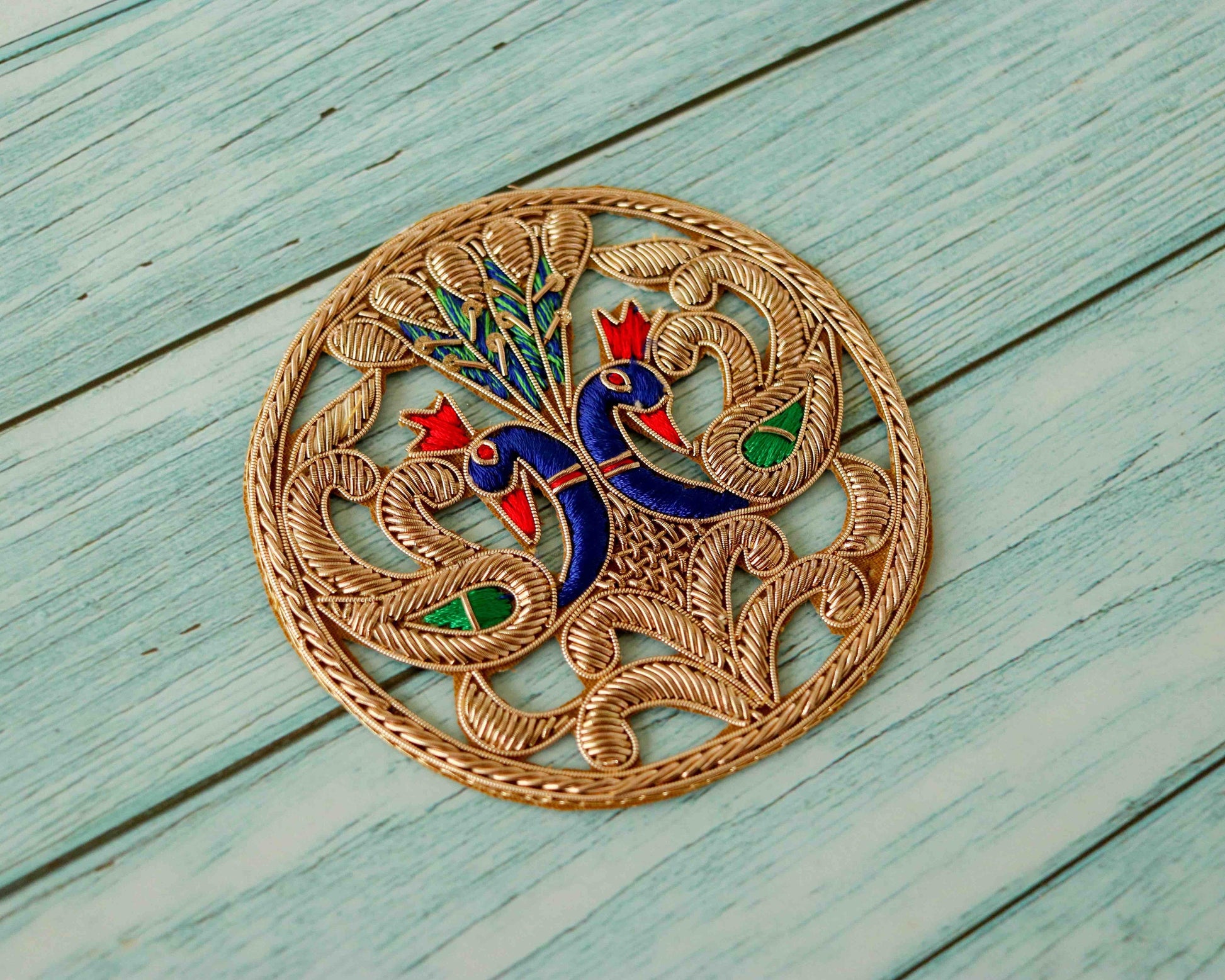 A beautiful handmade patch, created with embroidery with gold zari. With the pair of peacocks detailed out with blue and red silk threads. Made with intricate cutwork that will make it look like embroidery done directly on your fabric.