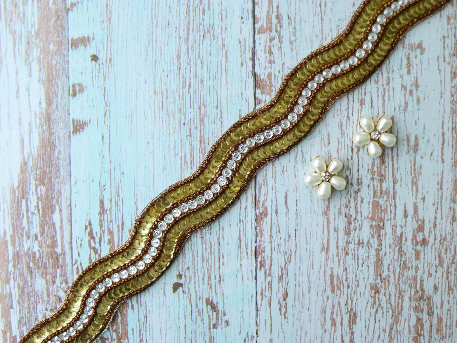 Vintage Gold Indian Embroidered Trim,Handmade Old Gold Leheriya Wave Design Border,Gold Sequin Lace,Antique Bridal Saree Border,Price/m