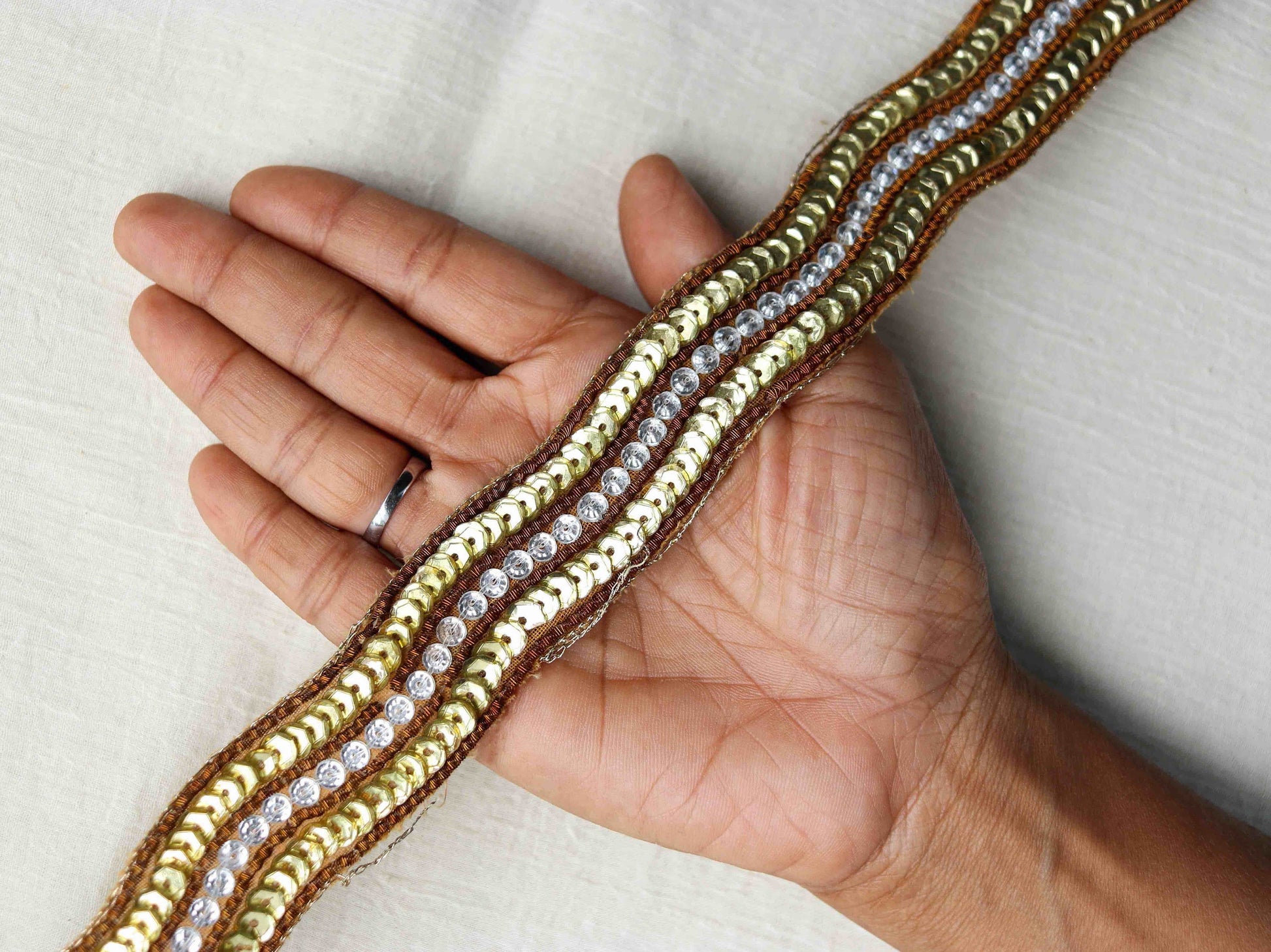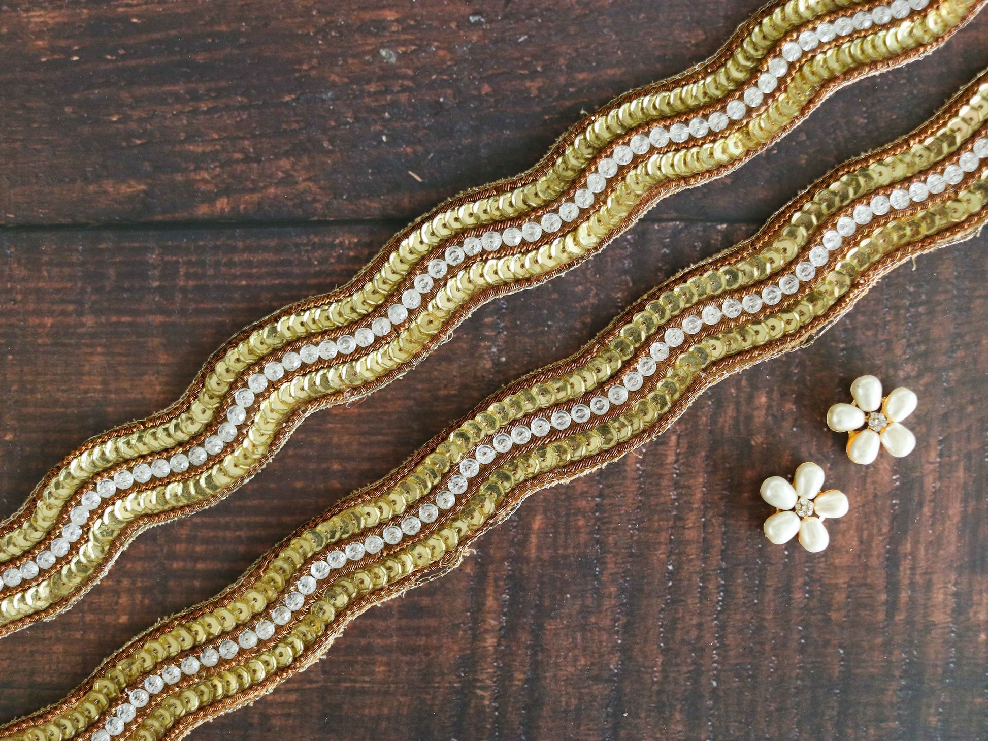 Vintage and precious, one of its kind! An elegant handmade trim that once adorned a beautiful saree, now discovered by the world. Created with sequins in gold and silver, and gold gold zari. With cutwork to create a wave liek design called 'leheriya'.