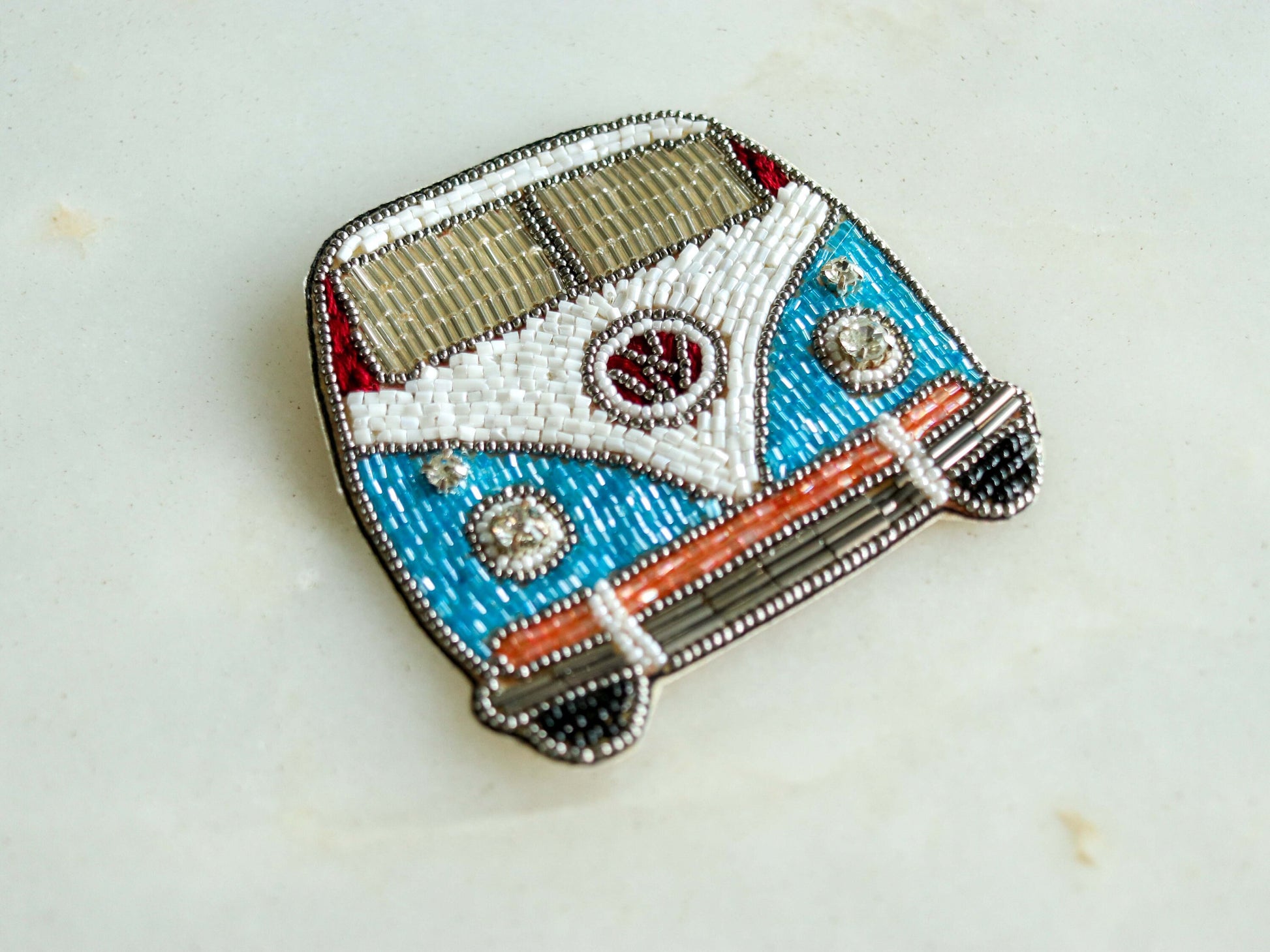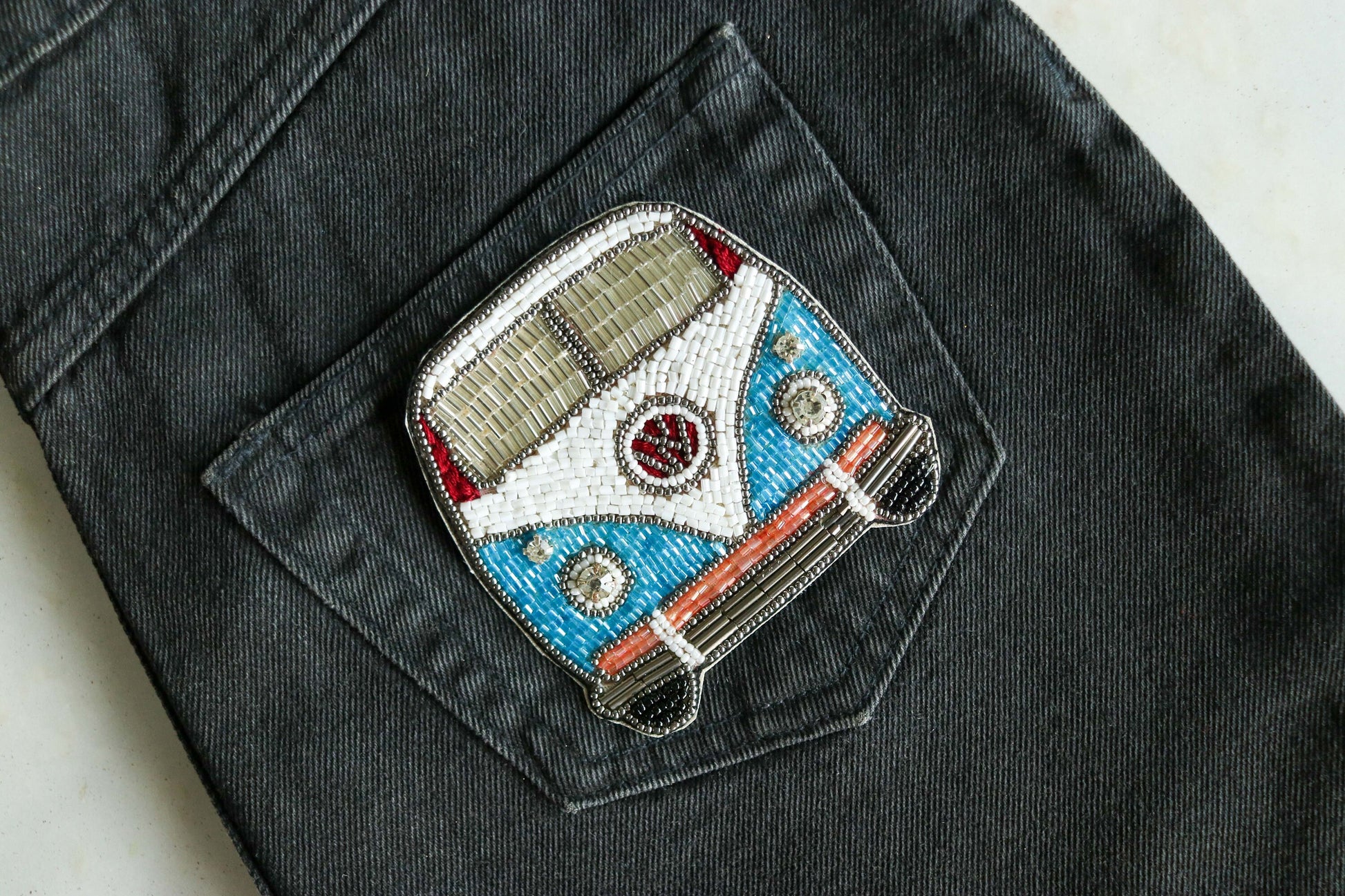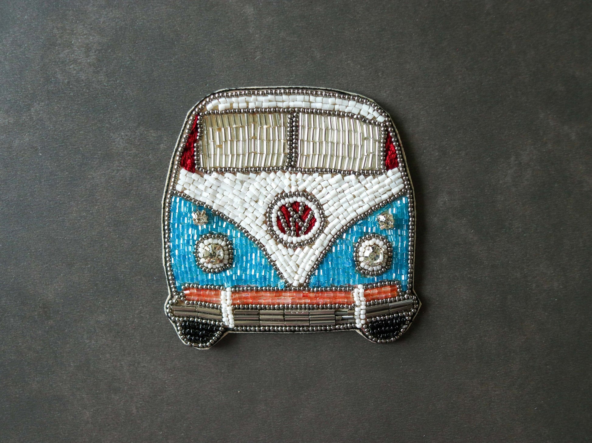 A very quirky patch in the shape of a vintage van, beaded and embroidered in pretty colours.