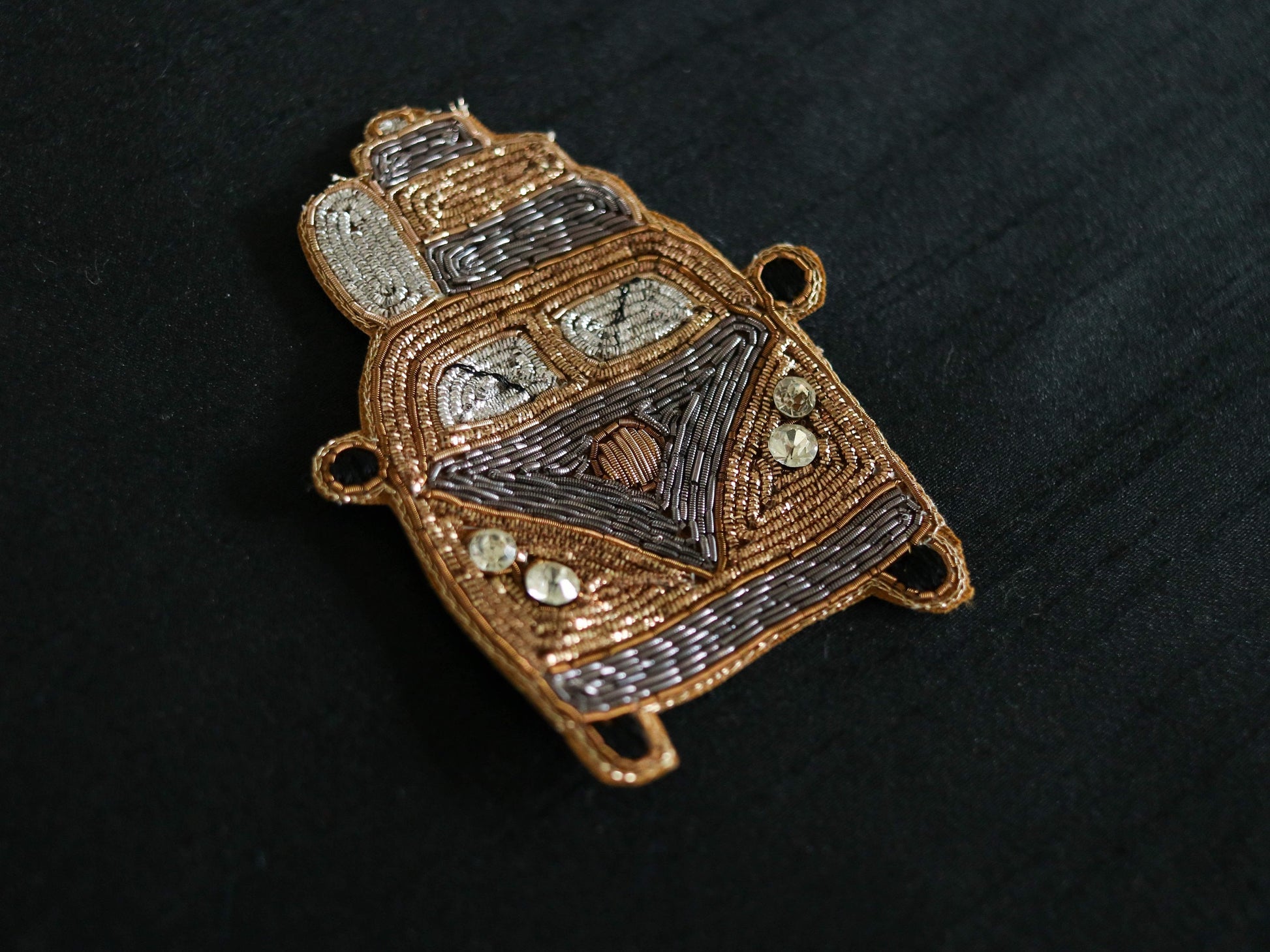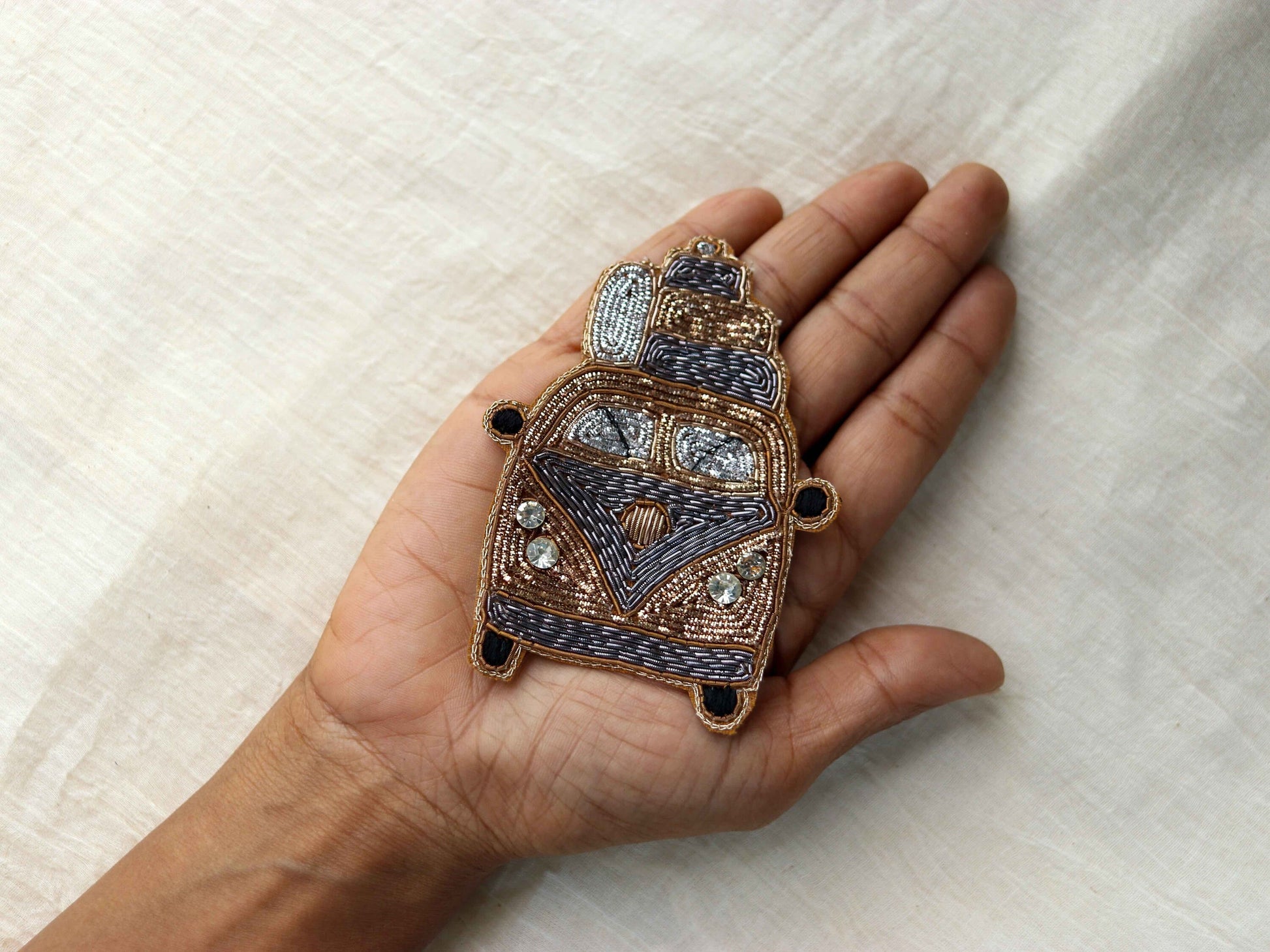 A very quirky patch, created in the shape of a vintage van, loaded with suitcases and bags. Created with zari in shades of gold, old gold and silver. Look closer to see the details like the wipers and the grill. Sure to add loads of fun to any project!