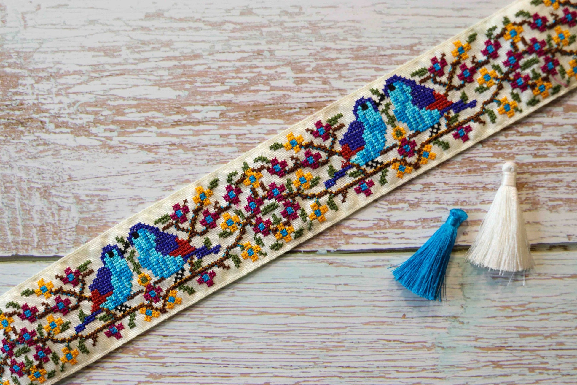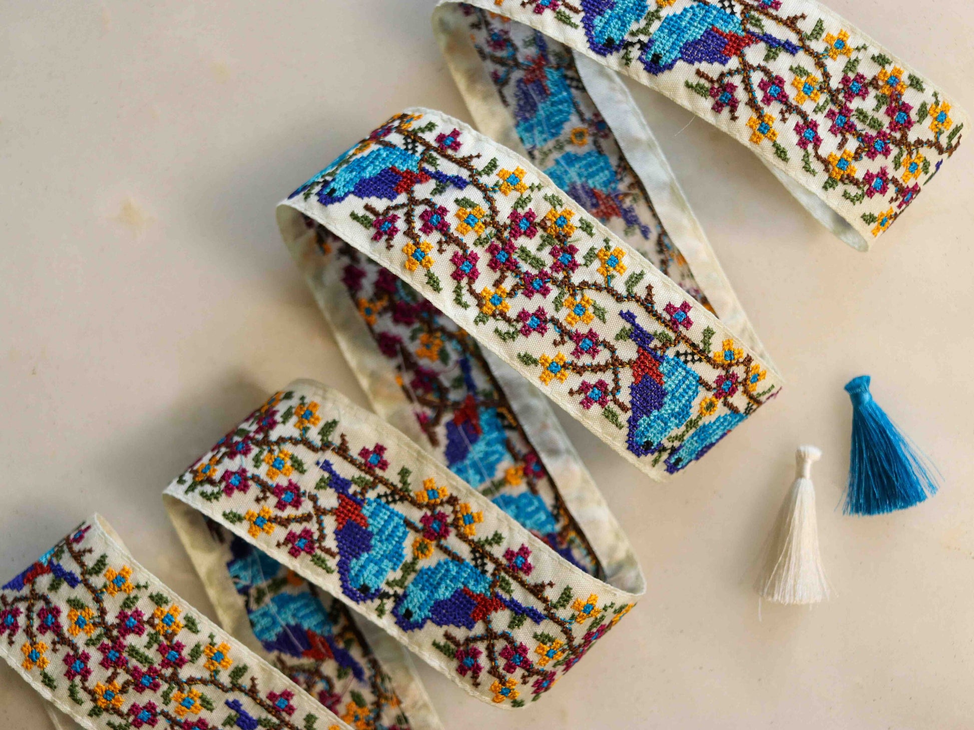 A gorgeous trim embroidered with birds and flowers, created with very fine cross-stitch embroidery, in the Kashmiri style. In vivid colours - blue, yellow, pink and green, on a soft off-white cotton fabric. Very regal, with a very old world-feel to it.