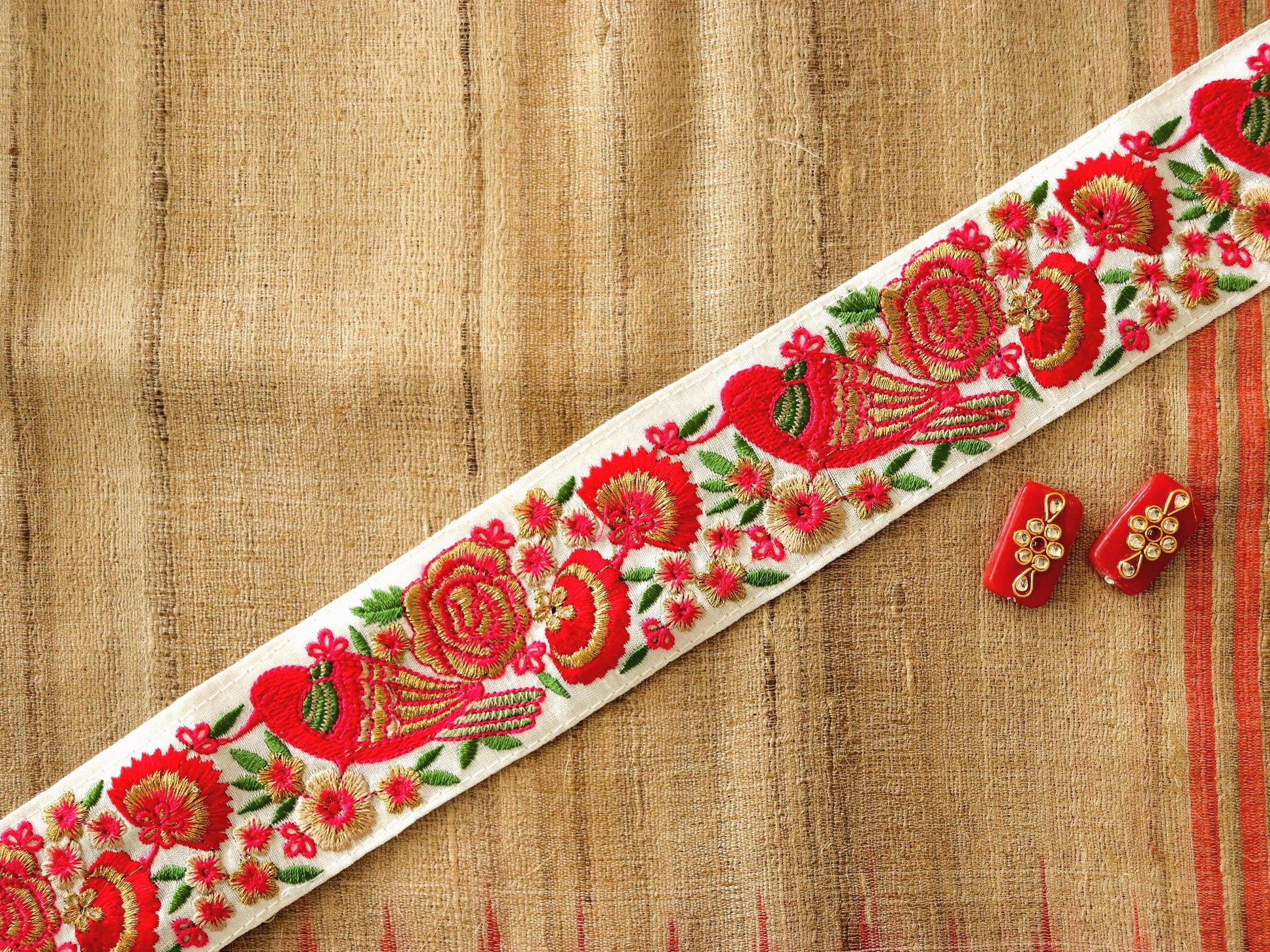 A beautiful trim embroidered with birds and flowers, created with very fine embroidery, in the Parsi style. In shades of red and pink on a soft white cotton fabric. Very cheerful and elegant!
