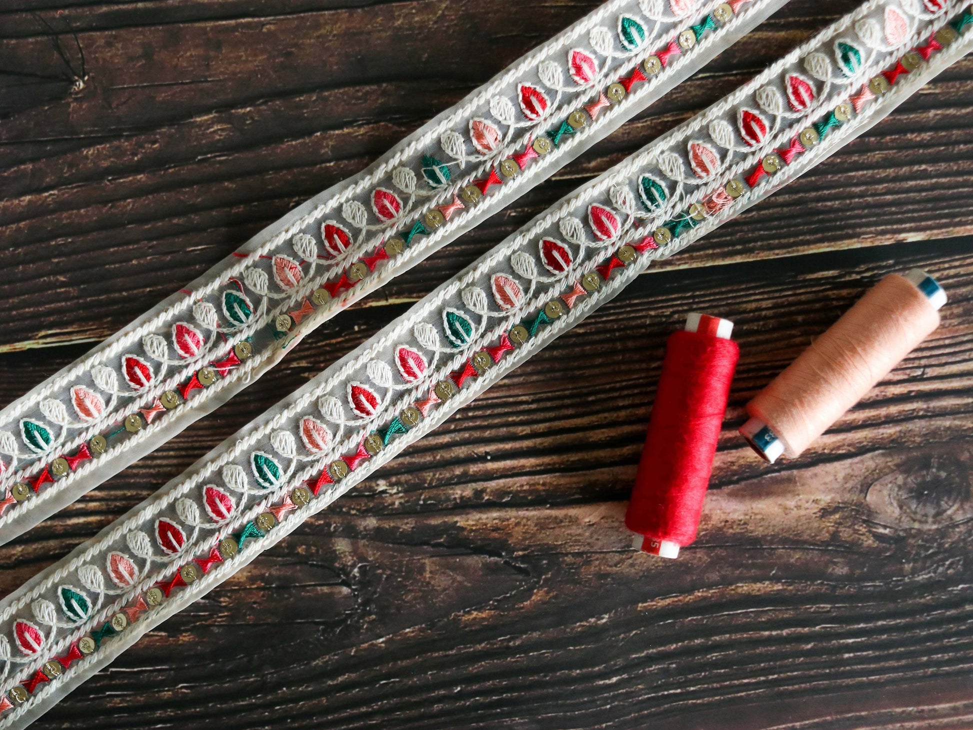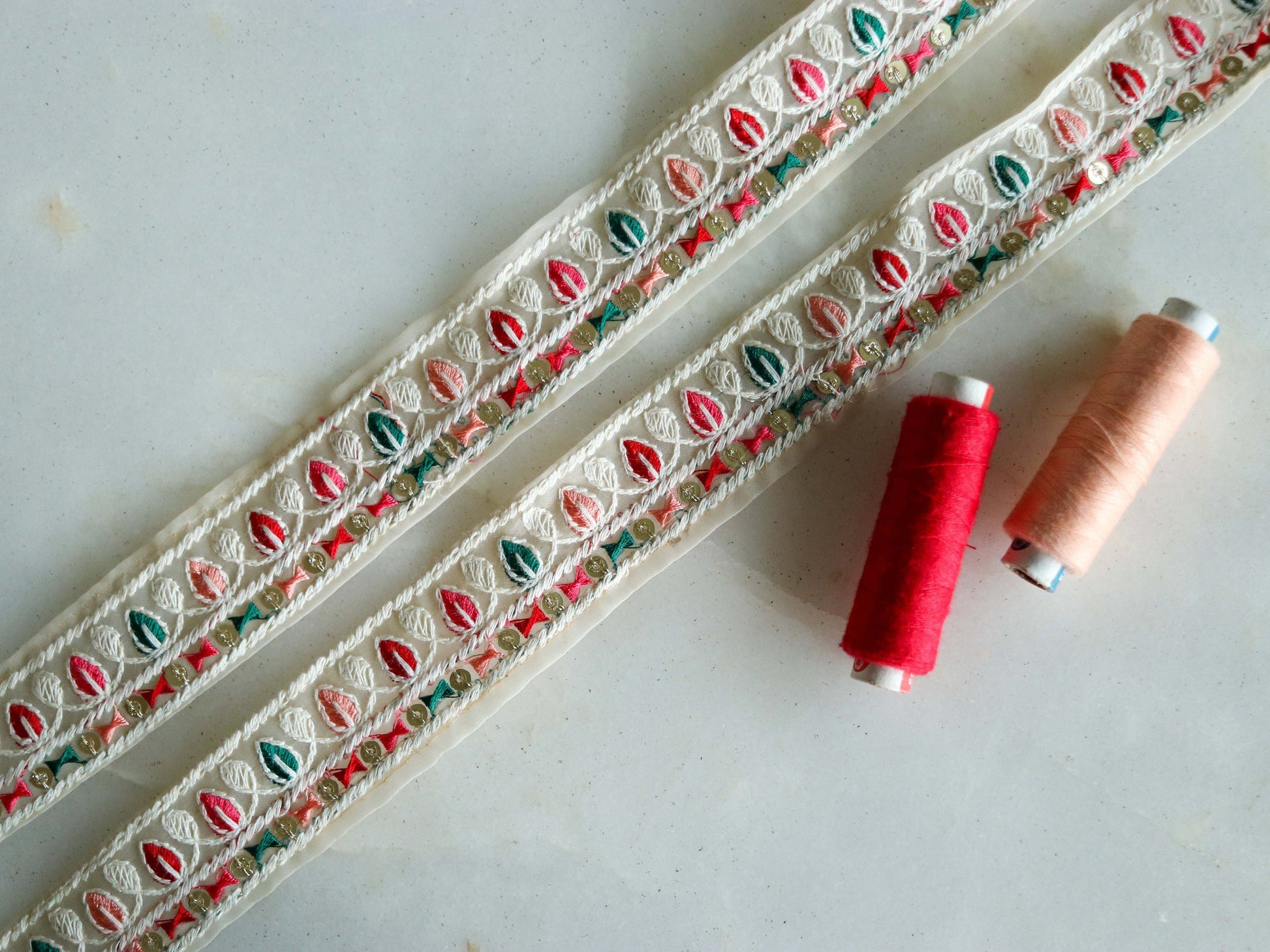 A pretty trim with a teardrop floral design created with delicate embroidery in the Kashmiri style. In shades of pink, red and green, on a soft white net fabric. Embellished with tiny sequins to add a touch of glamour. A saree border that is boho yet elegant in its own way.