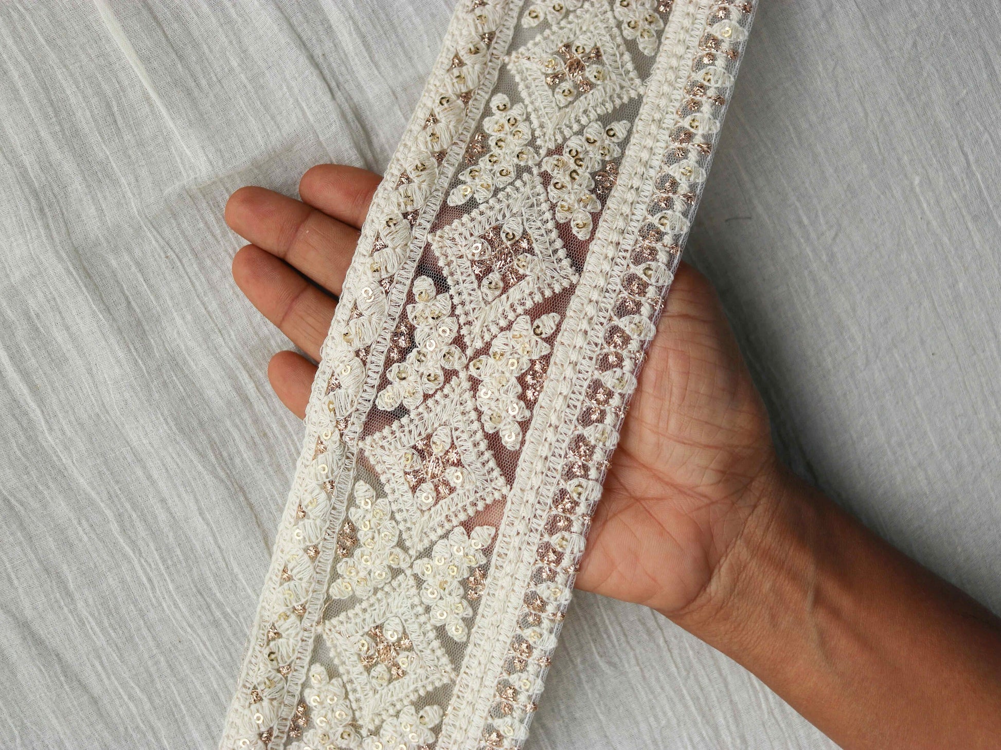 White Gold Floral Embroidered Trim, Indian Fabric Net Sequins Border, White Sequins Lace, White Gold Saree Border, 60 cm