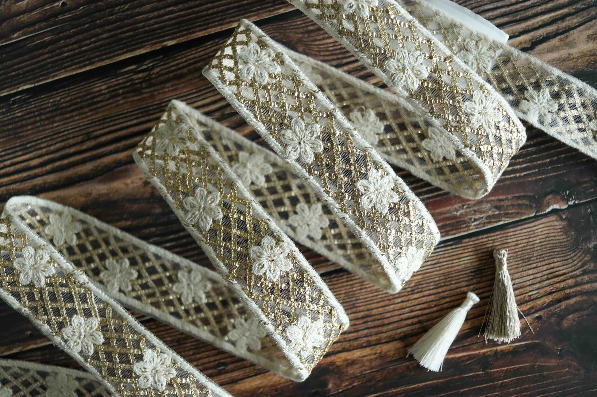 A trim that tiny flowers in white, sprinkled across a lattice of gold zari strips. Embroidered on a soft white net. And embellished with tiny light gold zari. Created in the Lucknowi/ Chikankari style of embroidery, characterised by floral patterns in white and light pastel shades. Exquisite and elegant!
