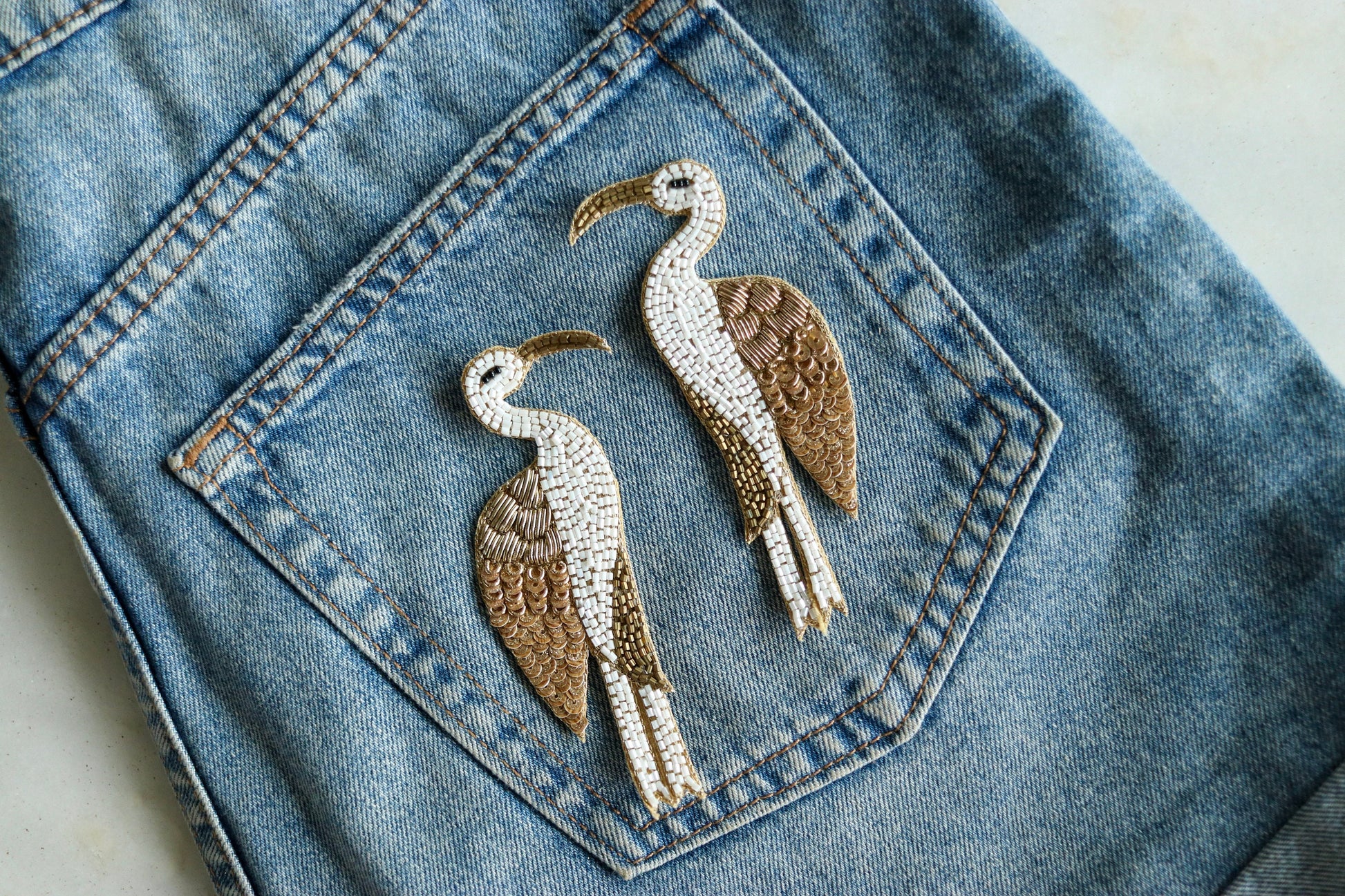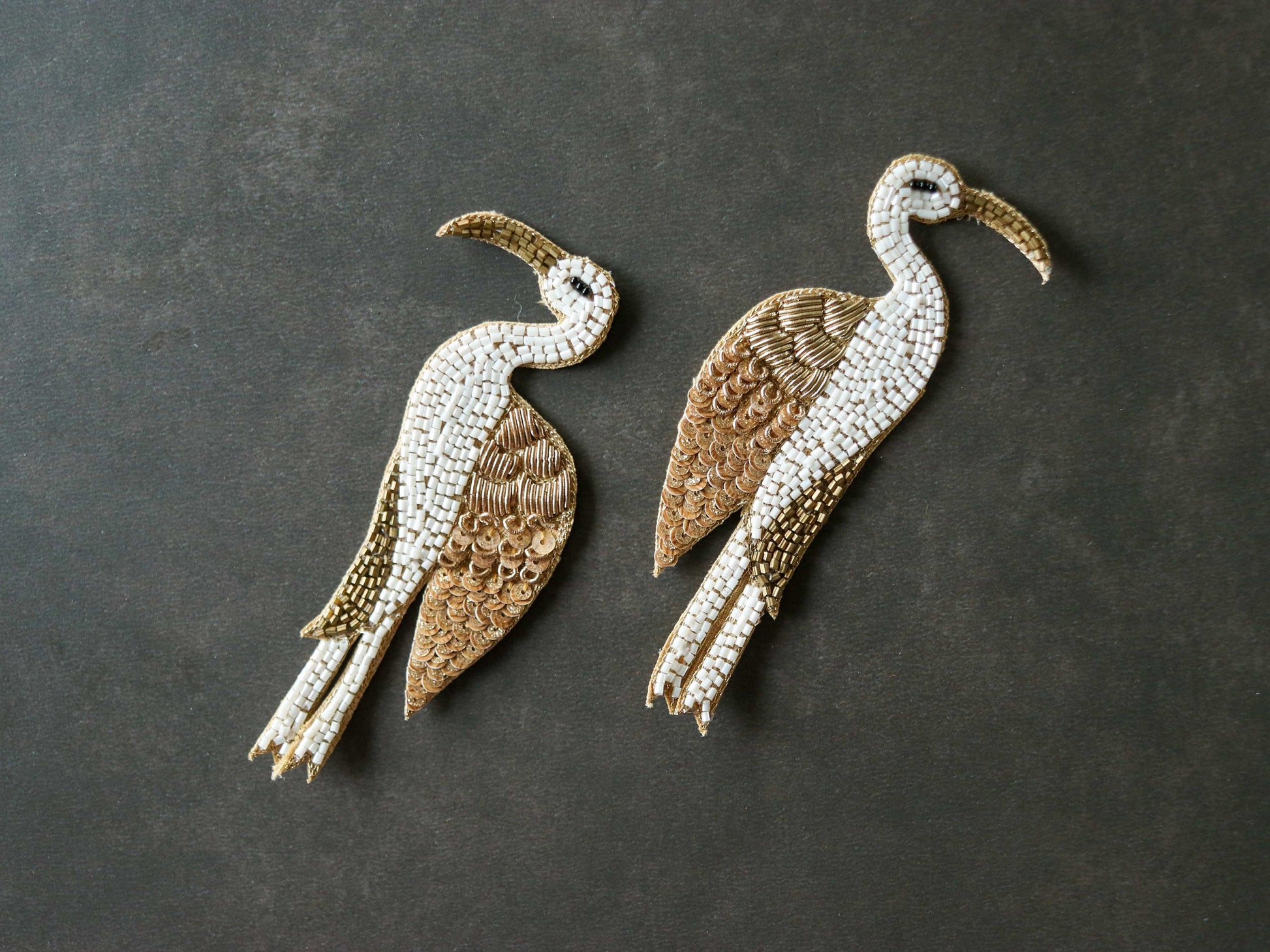 White Gold Stork embroidered patch,Handmade Bird sequin applique, Golden Indian bird zari patch,Sew on applique, Boho DIY Bird Patch