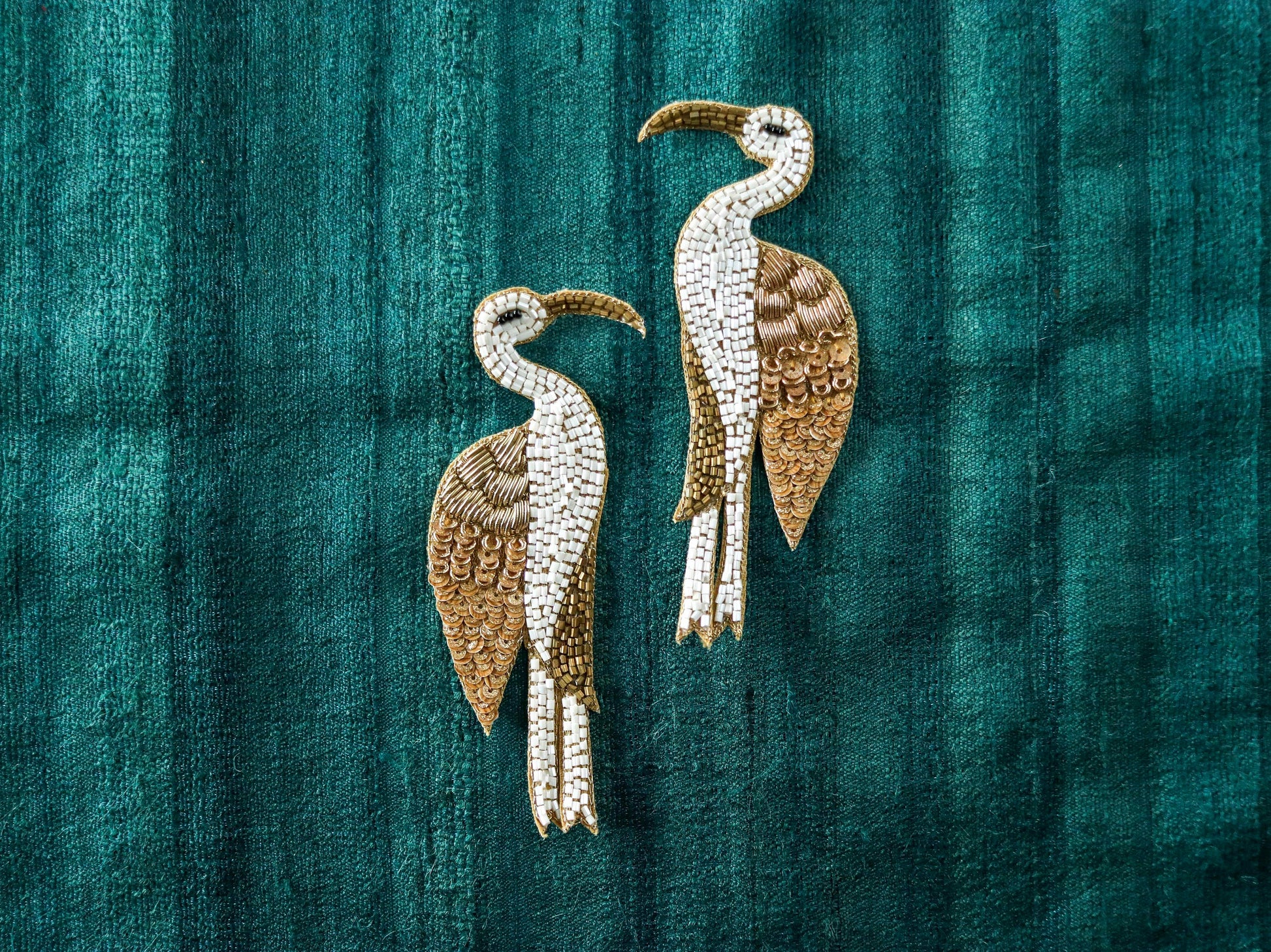 A beautiful embroidered bird patch, handmade with golden sequins, beads, zari and white beads, in the shape of a stork.