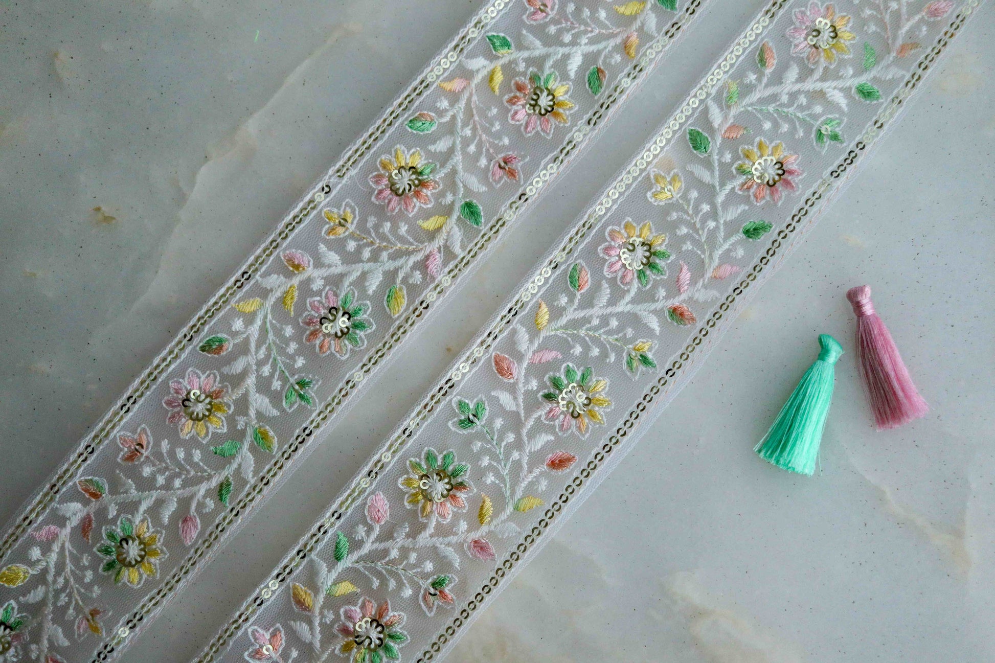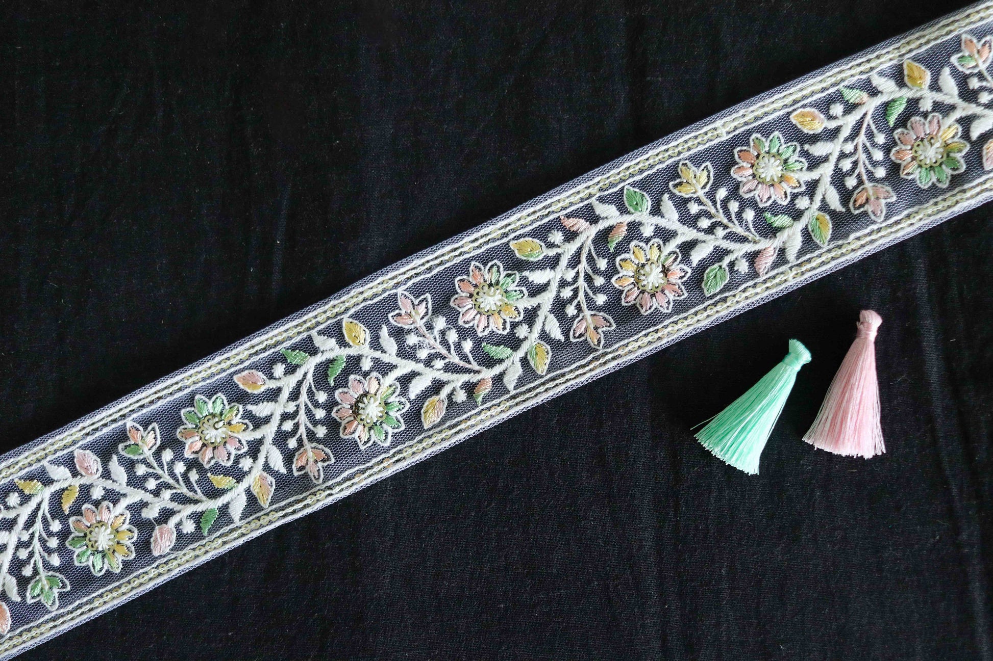 A trim that displays a vine of pretty flowers in pastel shades. Embroidered on a soft net fabric. And embellished with tiny light gold sequins. Exquisite and elegant, perfect for a white wedding!