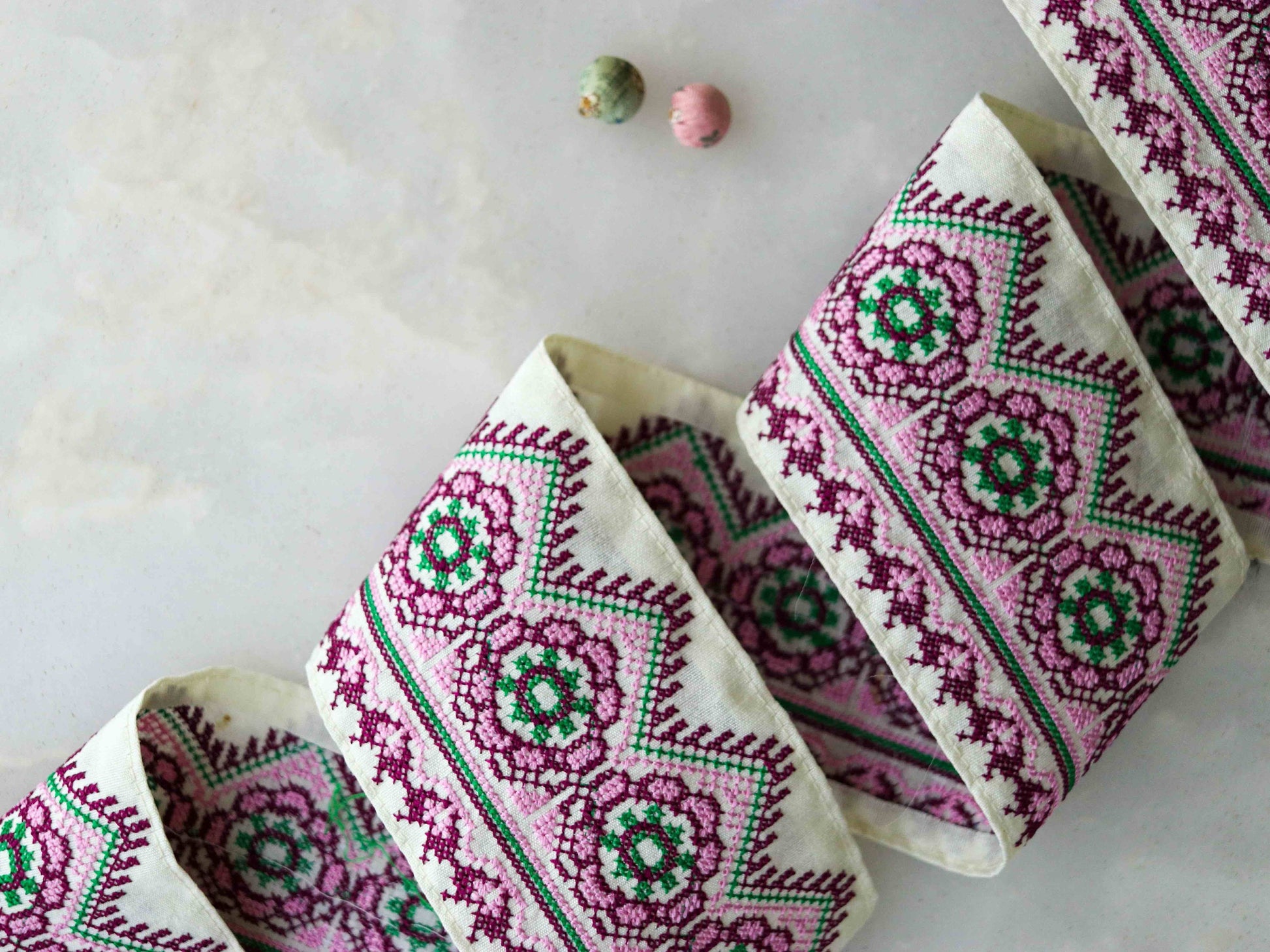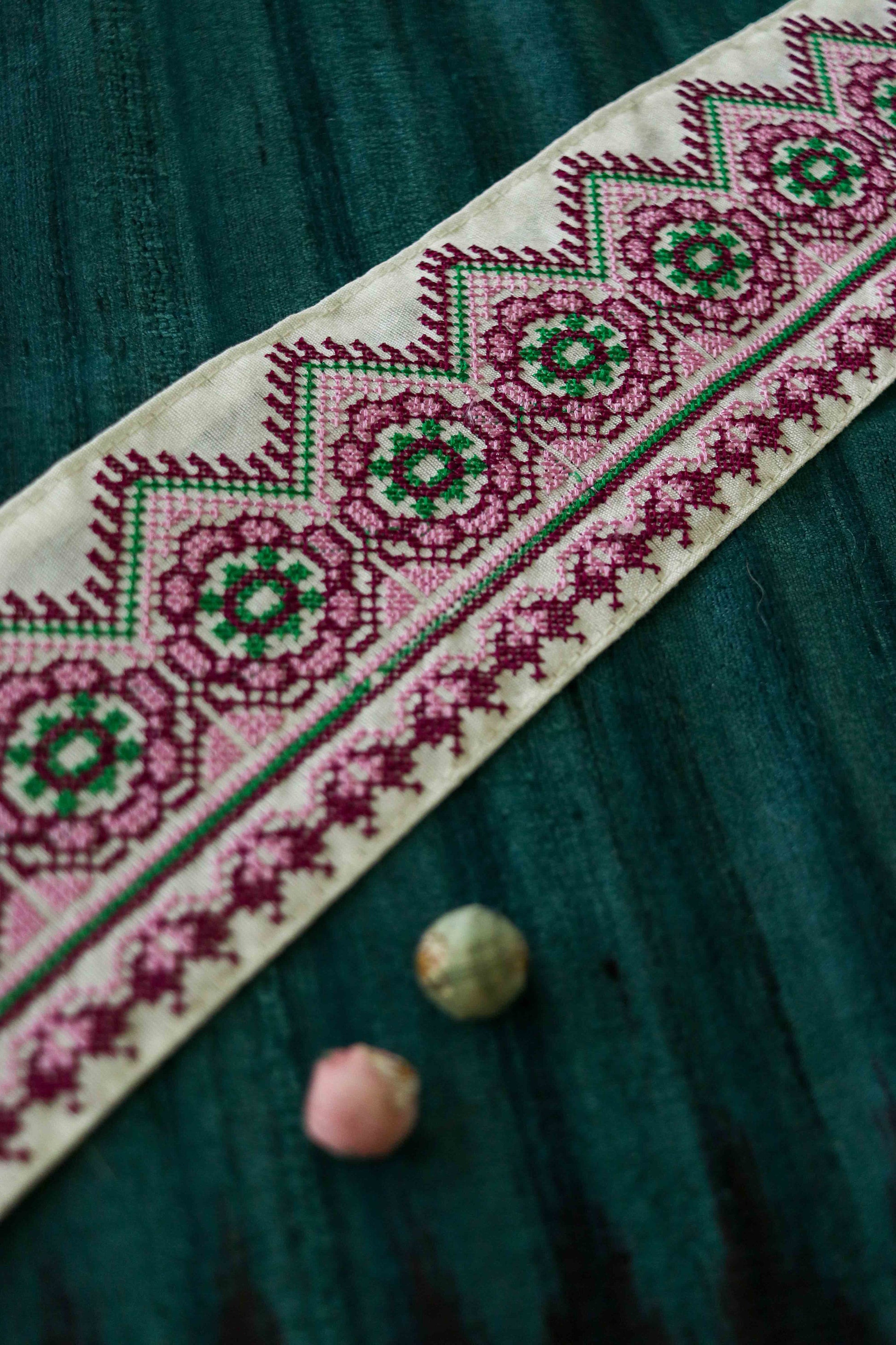 A temple design pattern created with tiny cross stitch embroidery, in the Kashmiri style. In soft shades of pink and purple. On a soft white fabric. A one of its kind trim, never seen before or again. Rustic yet elegant in its own way.