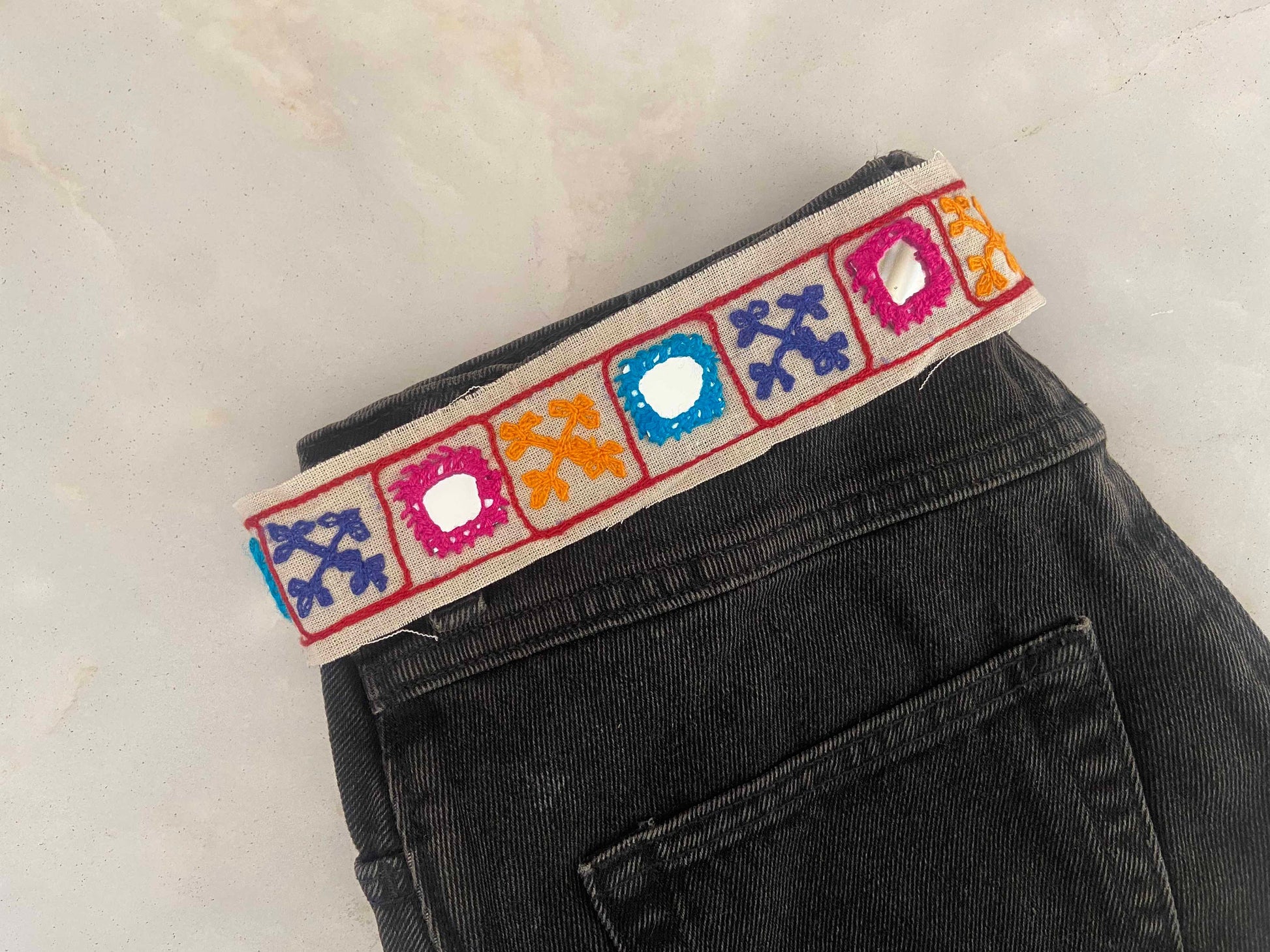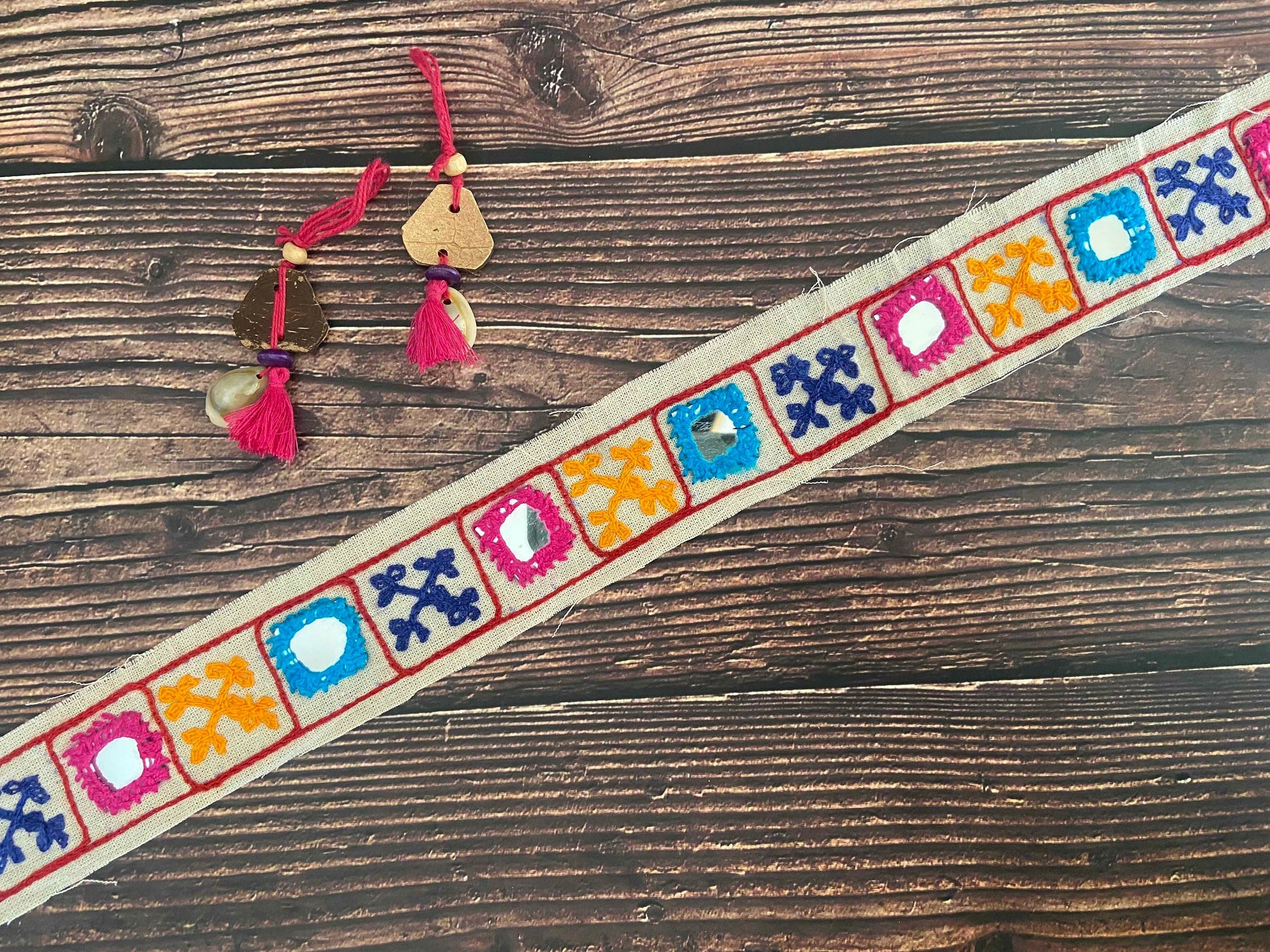 A boho trim, handmade with Kutchi / Sindhi style of embroidery, practiced by tribal women in the Kutch region of India. Sporting a geometric pattern with squares and crosses, created with small dense stitches in pink, blue and orange. With small pieces of real mirror embedded with embroidery. On a soft white cotton base.