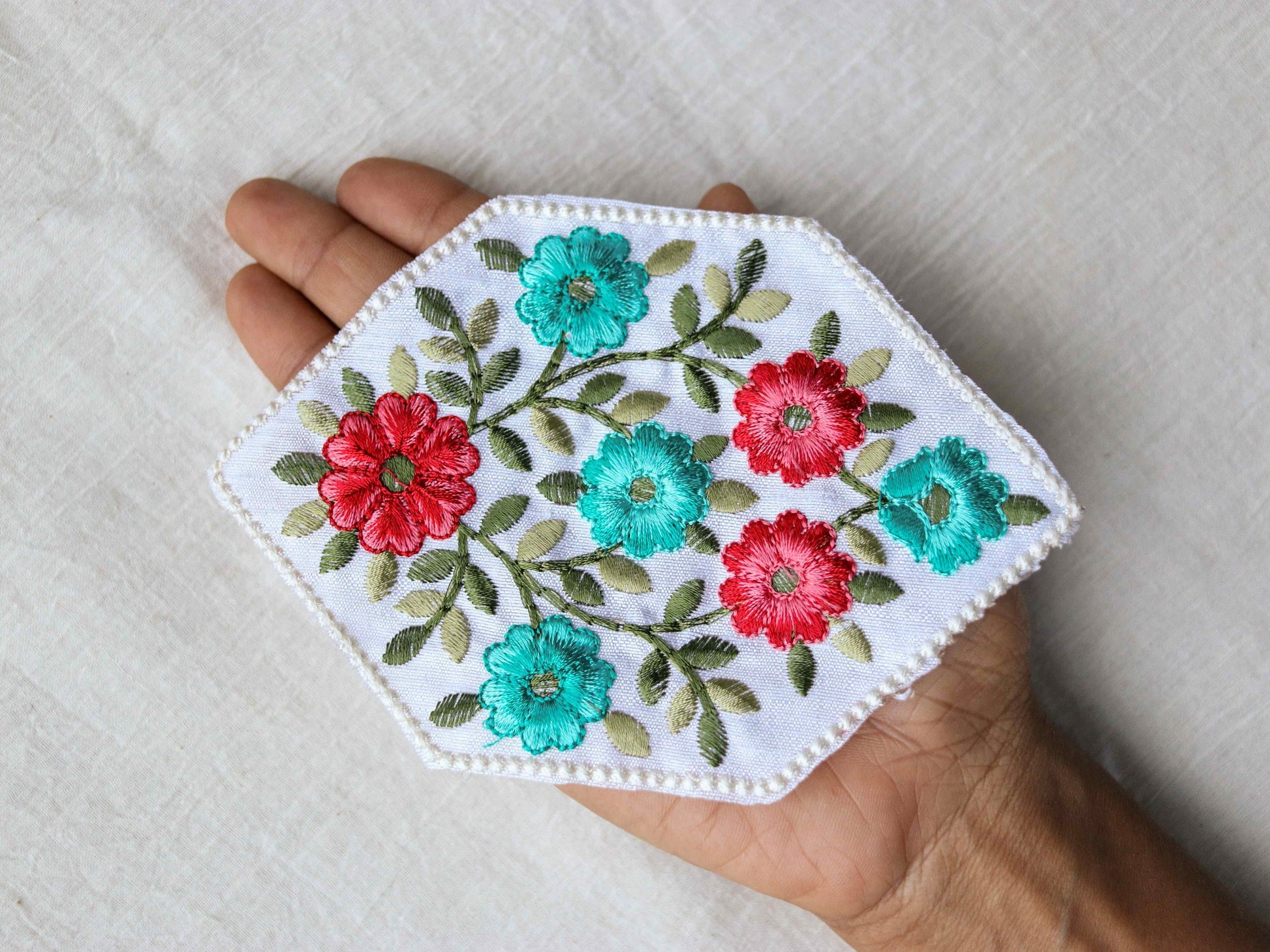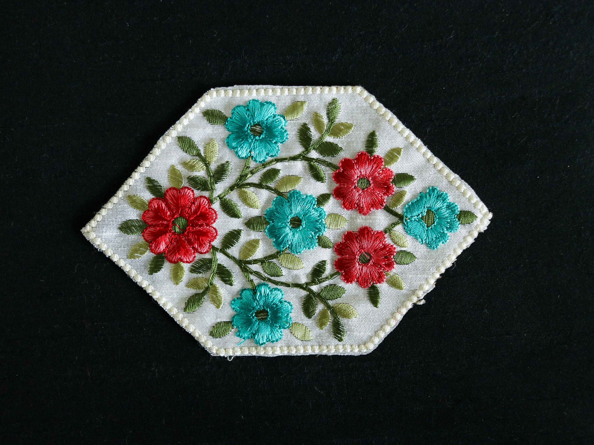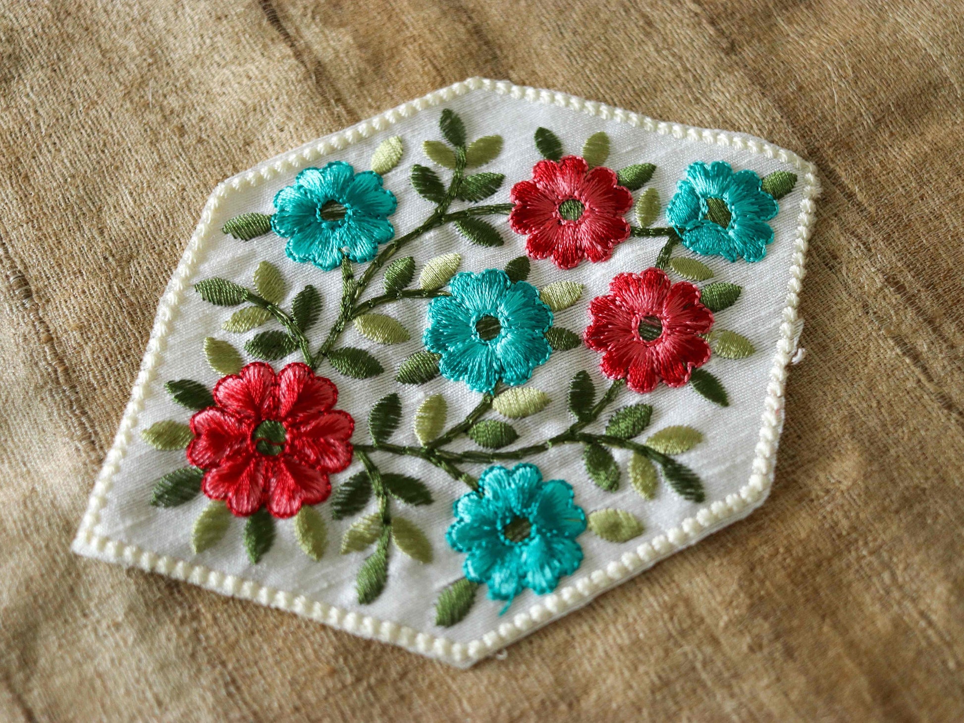 White Red Floral embroidered patch,White Teal Floral bouquet applique, Colourful fabric patch,Quirky Boho DIY Floral Patch