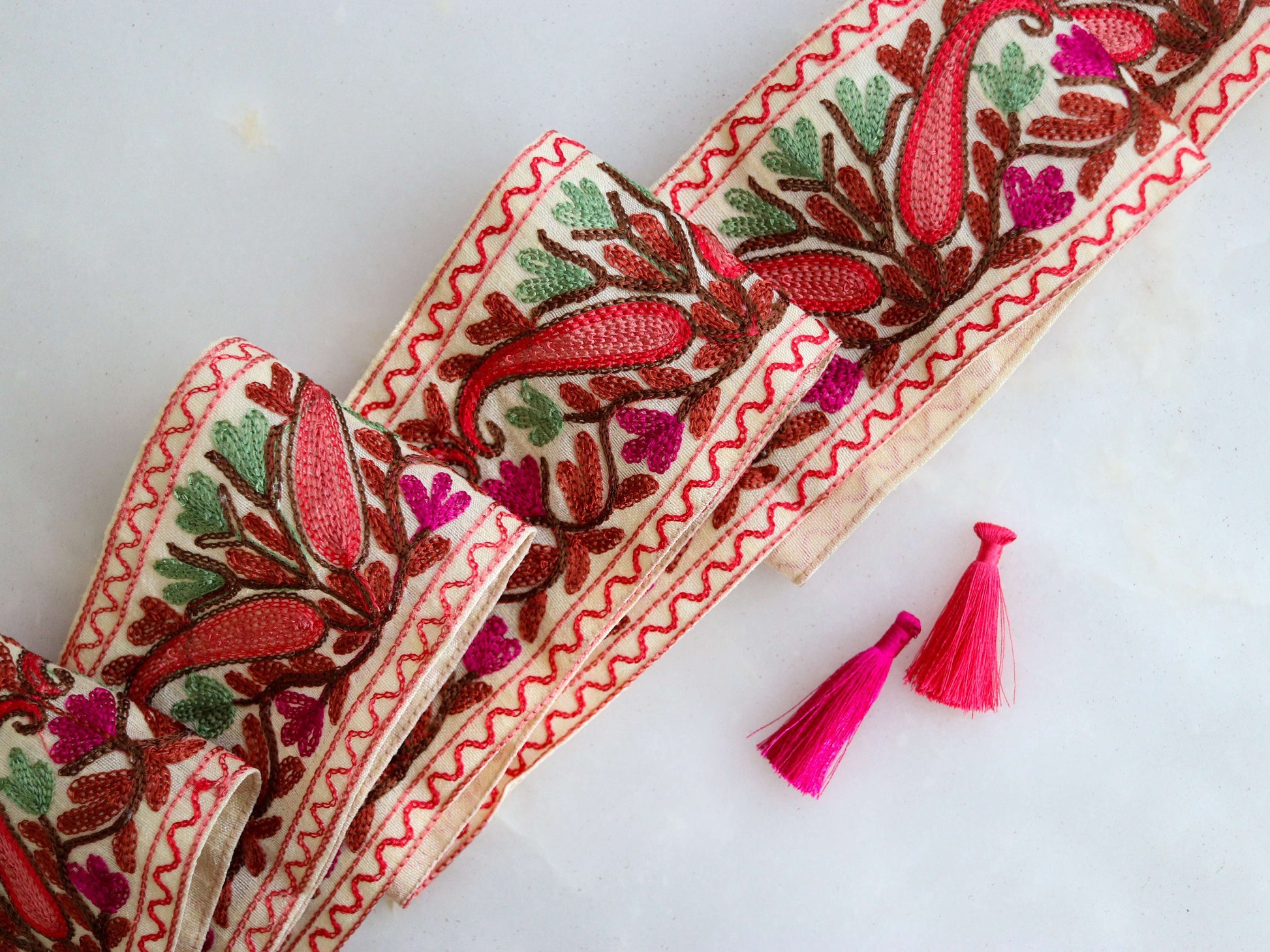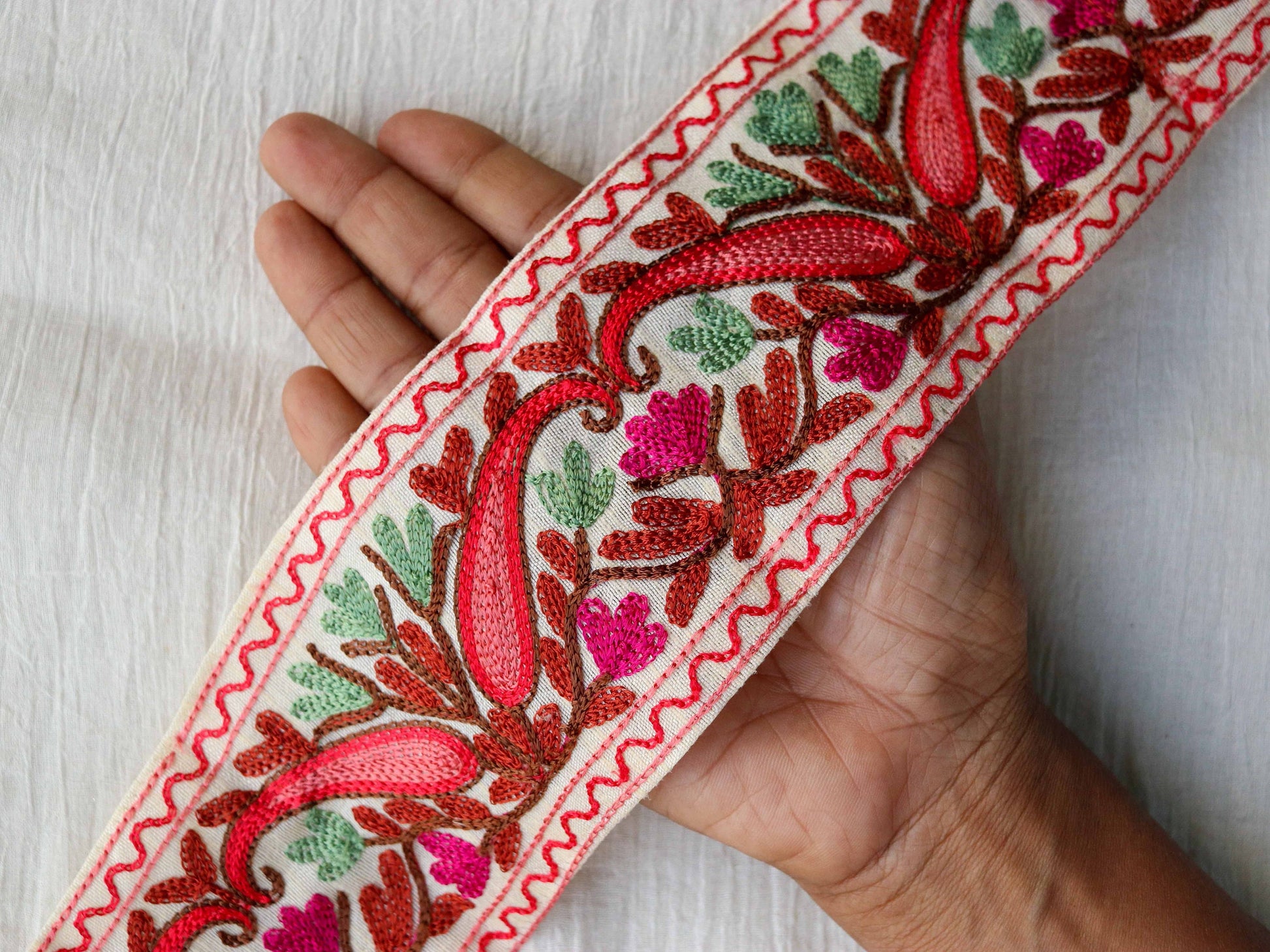 Pretty paisleys in red and pink, decorated with vivacious flowers. On an off white cotton fabric base. A beautiful trim created with Kashmiri style embroidery. That is so delicate it looks like a painting. Sure to make any project look like a heritage piece.