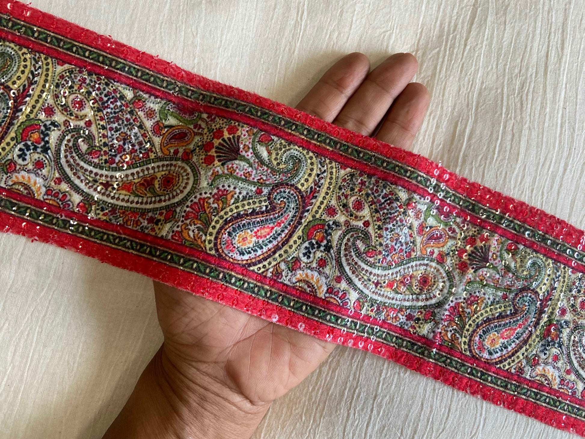 White Red Paisley Sequin Trim, Digital Print Border, Self Sequin Embroidered Lace, Boho Floral Trim, Indian Fabric Saree Border,