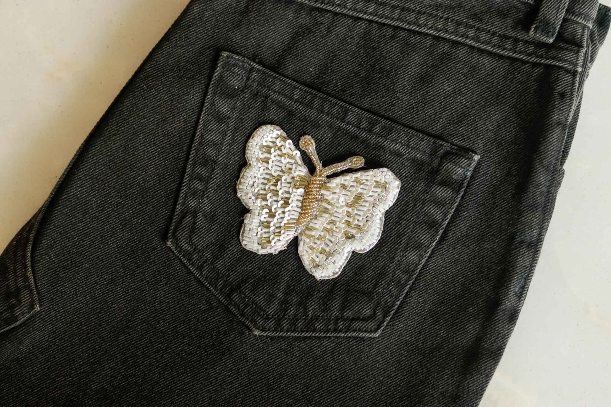 This gorgeous handmade patch captures the beauty of a butterfly. Created with delicate sequins and beads in white. Embellished with tiny beads in gold. Each detail of the butterfly brought out with love and with different elements. Adding just the right amount of sparkle to your day.
