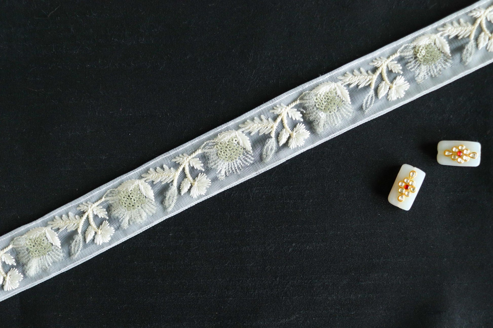 White Sequin Floral Embroidered Trim, White Floral Net Border, Floral Sequin Lace, Indian Trim, White Saree Border, インド刺繍リボン, Price/mtr
