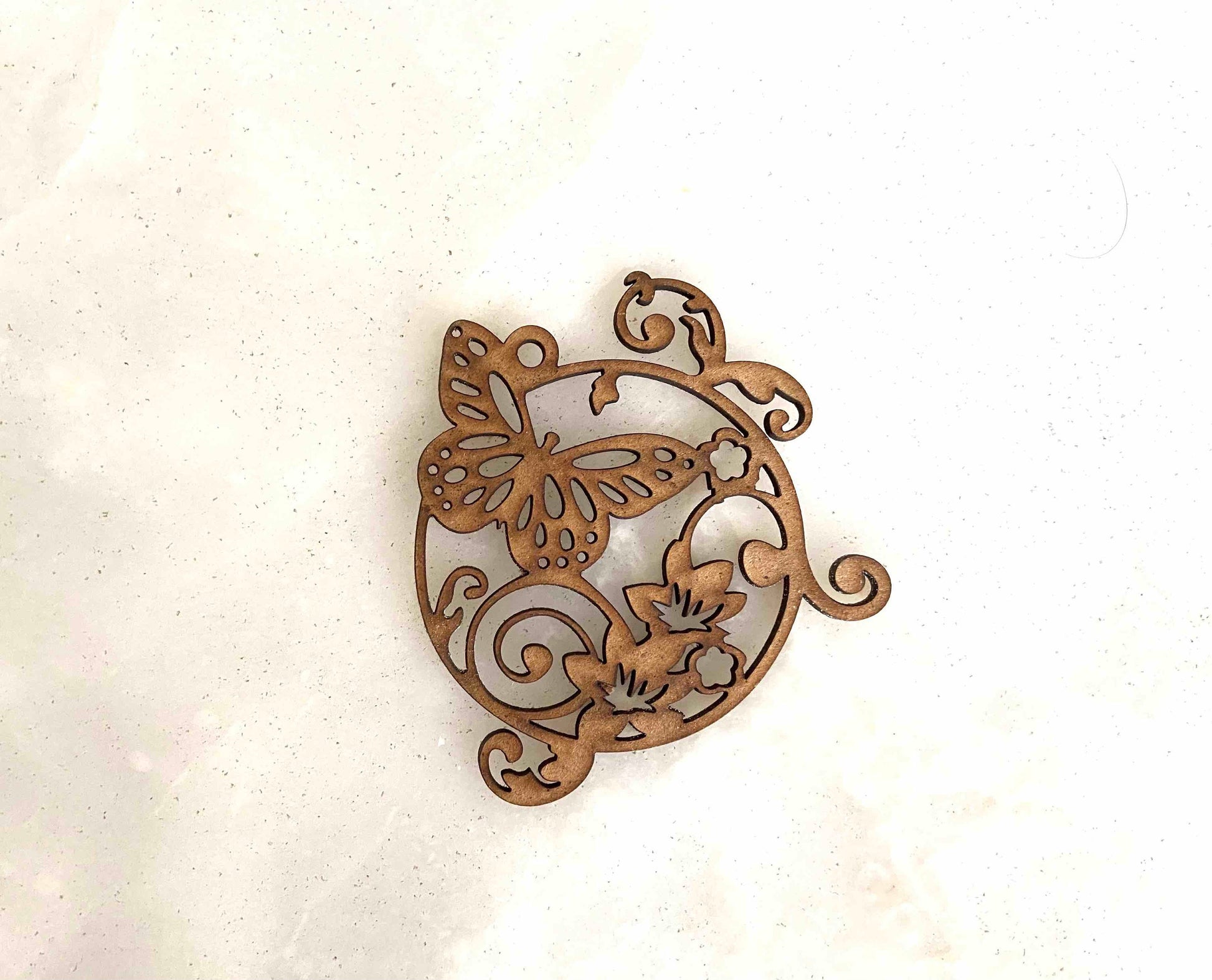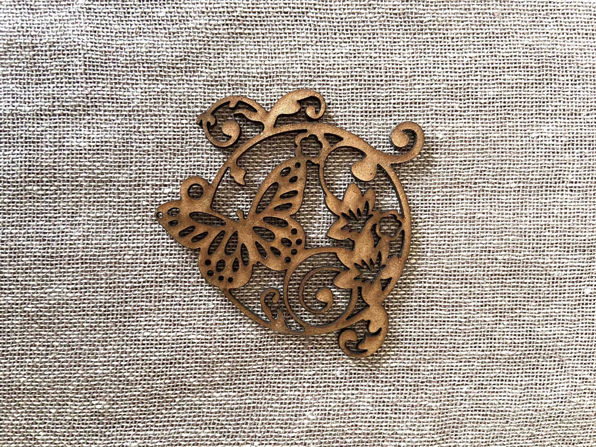 Pretty little charm created with wood in the shape of a butterfly. Shaded to show the details of the creature and of the flowers.