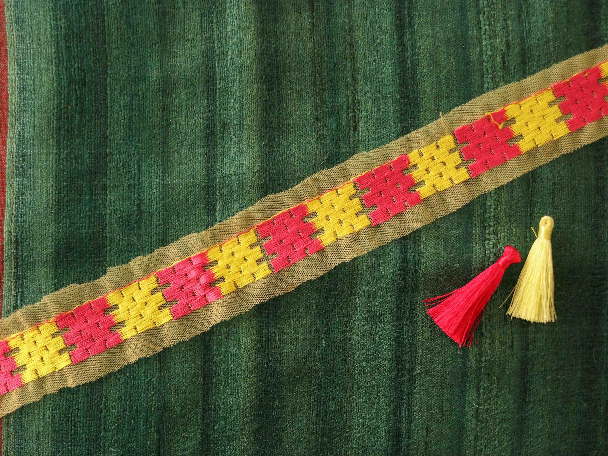 A cheerful, colourful trim, created with embroidery in the Phulkari style.