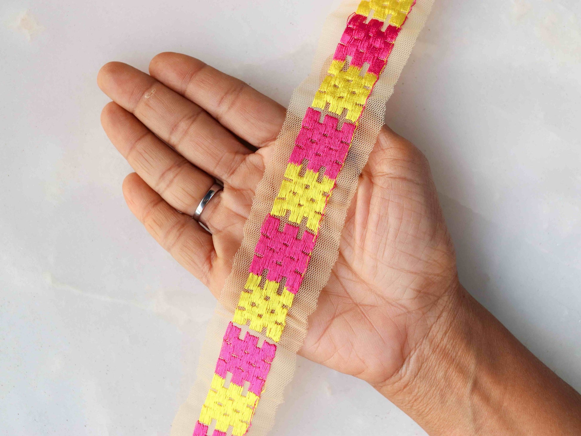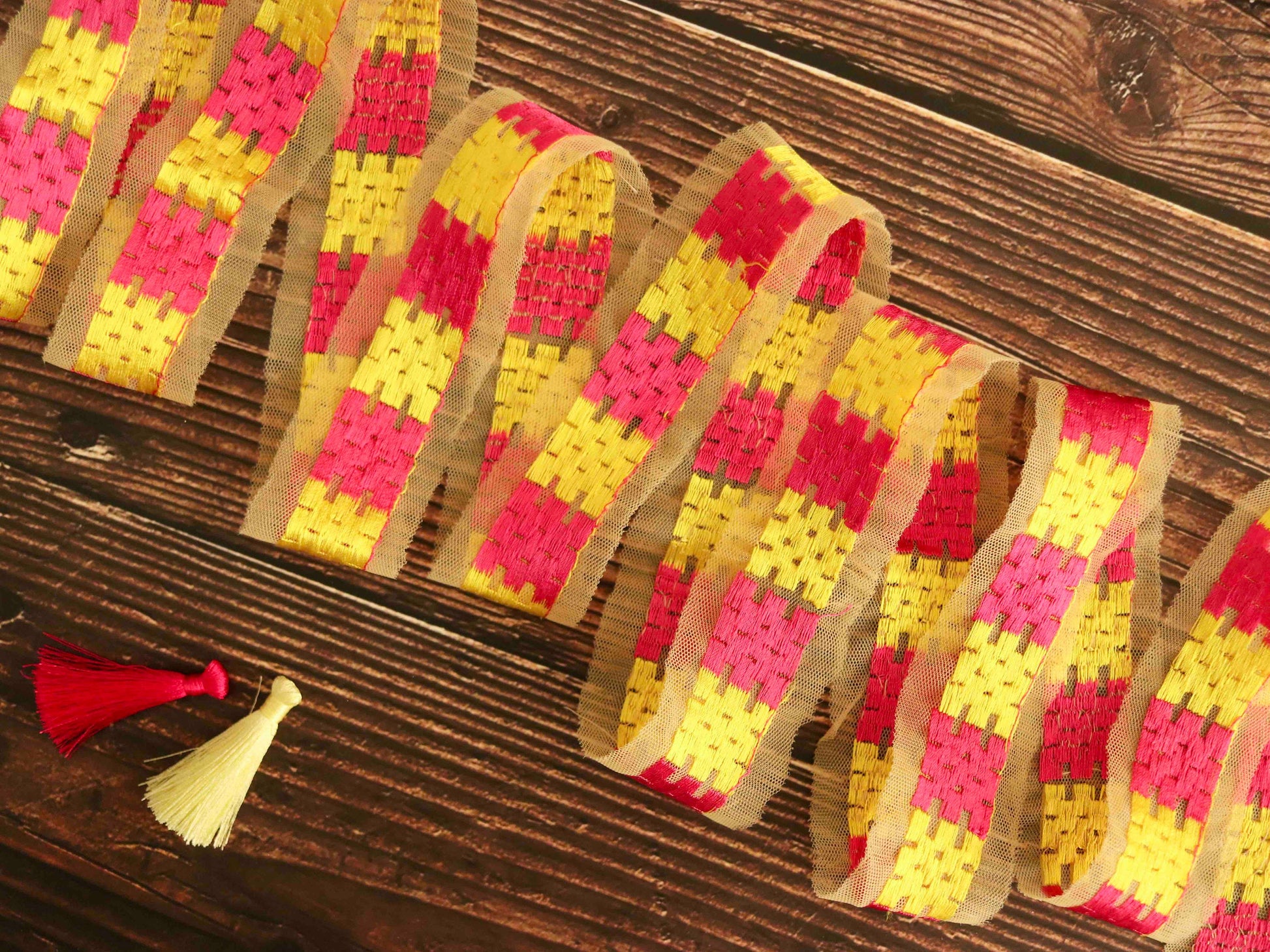 Yellow Checks Embroidered Phulkari Trim,Indian Border,Yellow Pink Geometric Multicolour Net Lace,Boho Hippie Phulkari Saree Border,Price/mtr