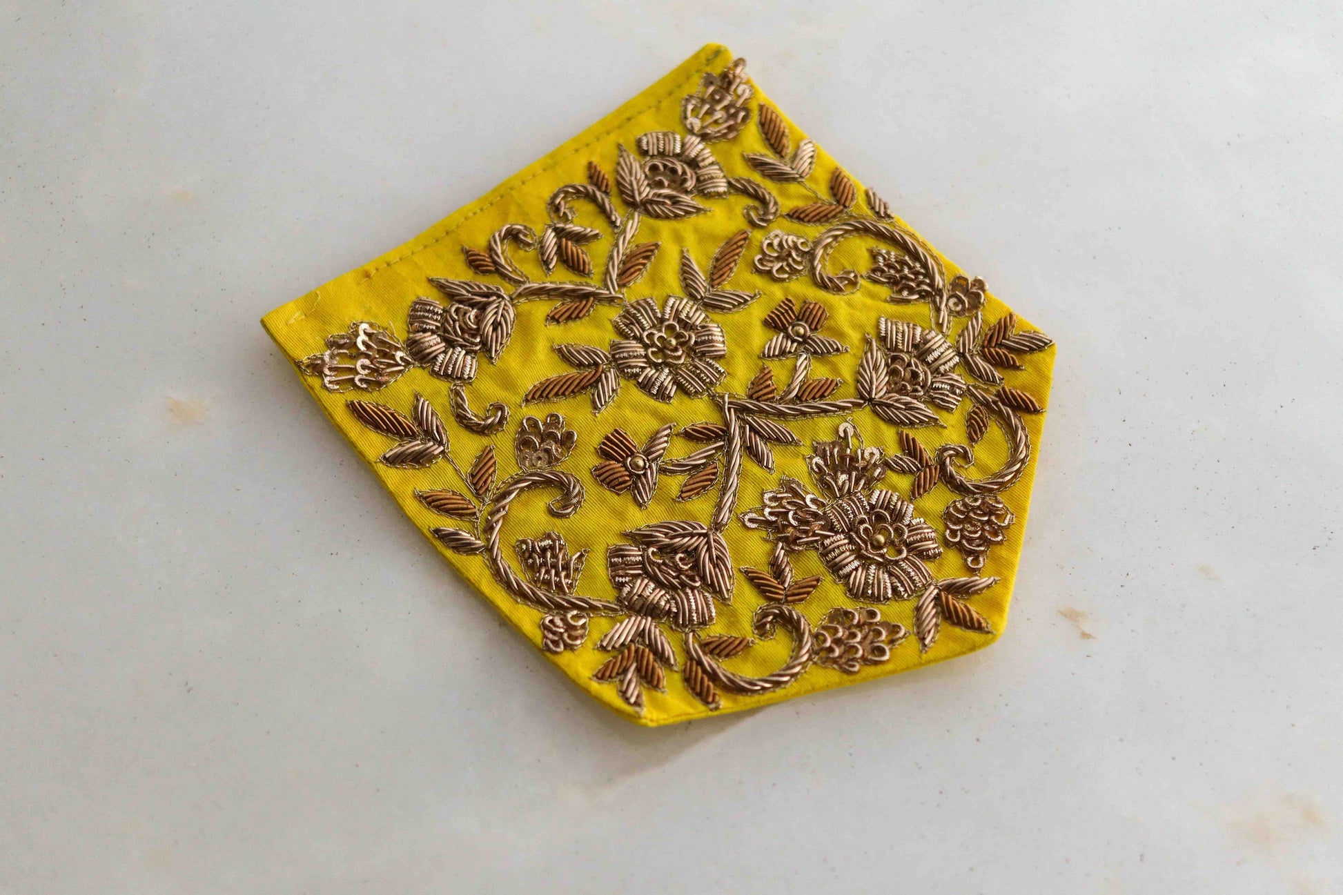 Quaint pocket shape patches in a vibrant yellow. Handmade with embroidery in 2 gorgeous designs. A hexagon with 4 pretty flowers made in pink. And a pocket shape patch, with a very regal floral motif in golden zardozi style embroidery.