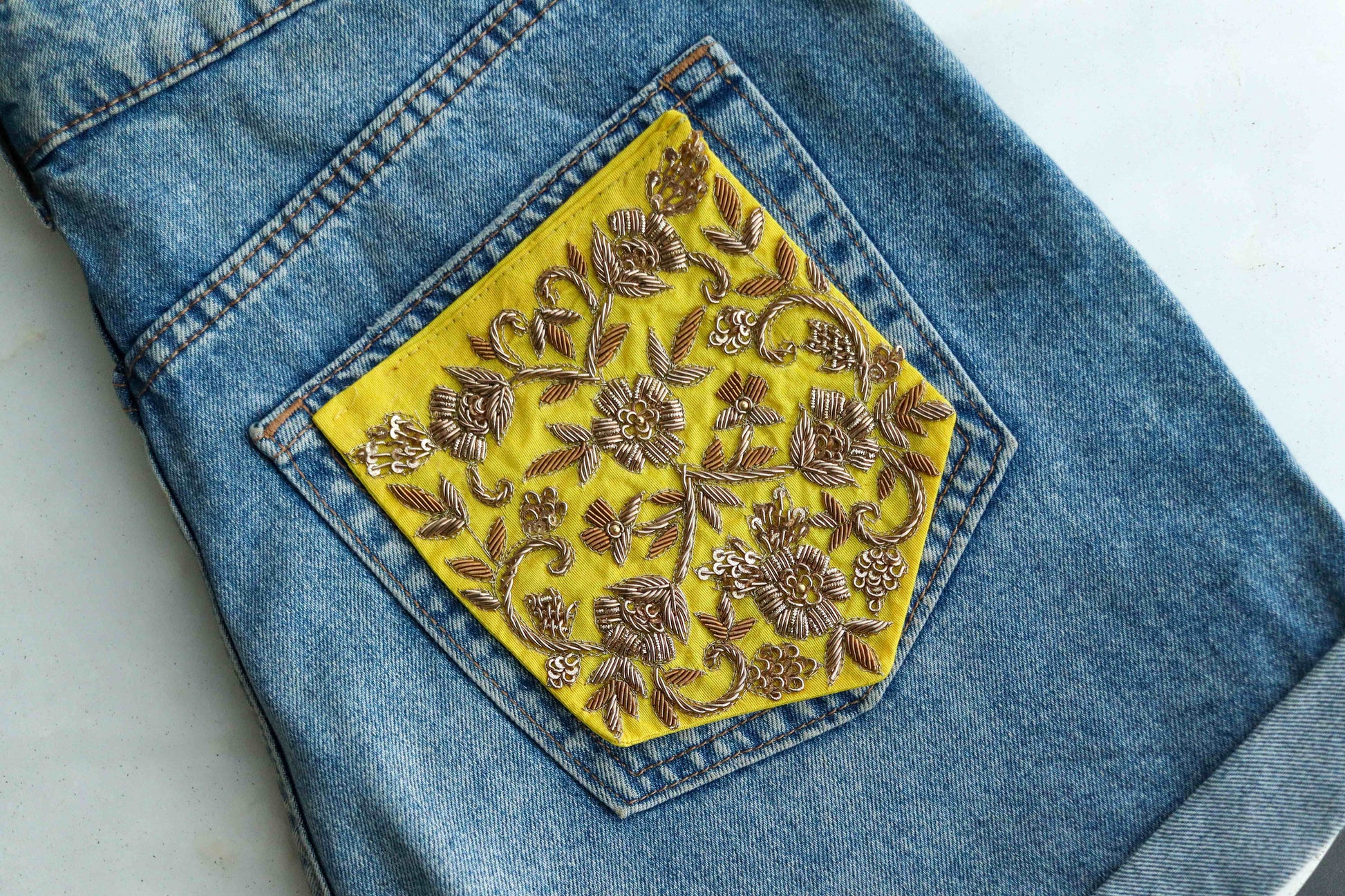 Yellow Gold Embroidered Pocket Patch,Handmade Indian Yellow Pocket Applique, Boho Kitschy Floral Patch,DIY Denim Jacket Patch