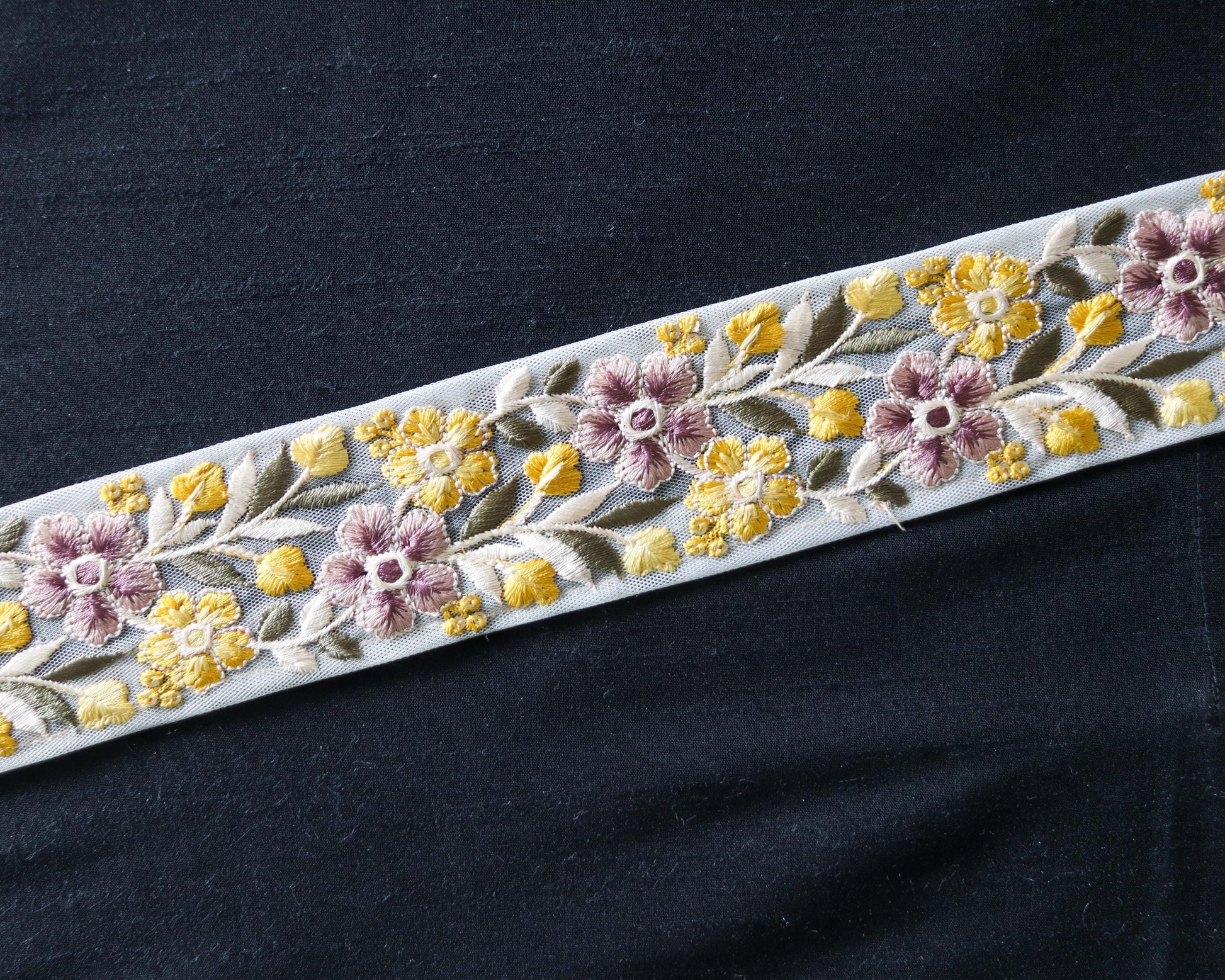 Yellow Mauve Floral Embroidered Trim, Spring Floral Border, Yellow Purple Net Lace, Indian Fabric Trim Saree Border, インド刺繍リボン, Price/mtr