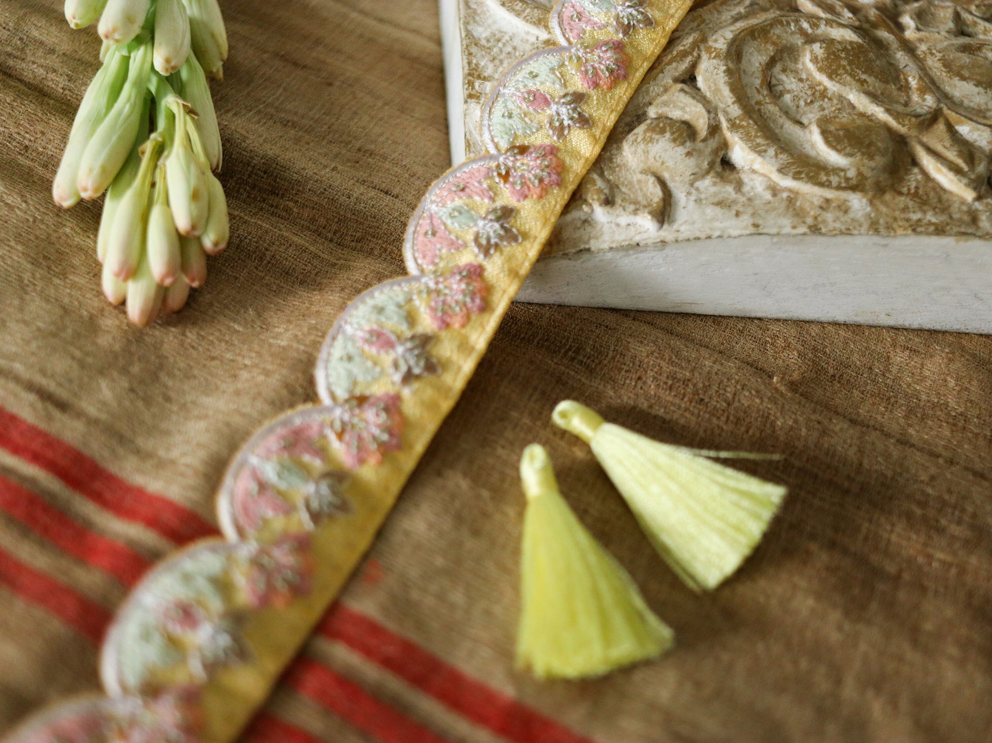 Yellow Pink Scallop Embroidered Trim,Pastel Floral Border,Yellow Pink Floral Lace,Pastel Yellow Saree Border,Indian Fabric Trim,Price/mtr