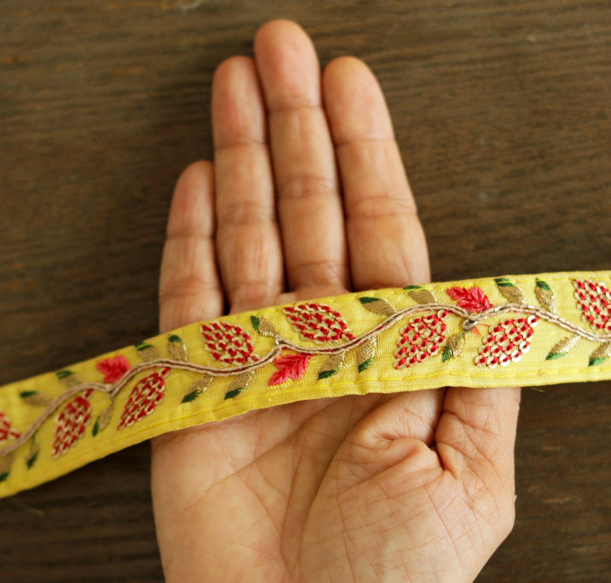 Simple and elegant, dressy yet subtle. Here's a pretty trim with a floral design created with red and gold embroidery on a yellow cotton silk fabric. The tiny sequins in the red leaves make add just the right touch of bling. And the light gold zari brightens up this subtle border.